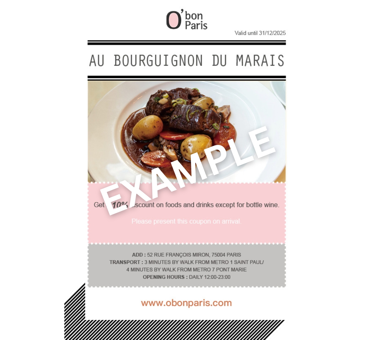 (4) Come to AU BOURGUIGNON DU MARAIS, present the coupon and enjoy your discount.
