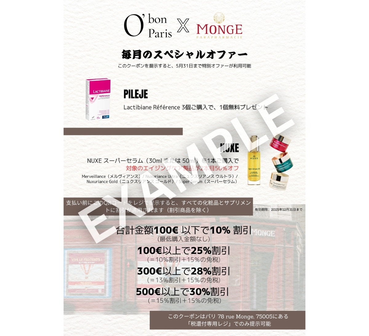 - モンジュグループでは、O’bon Parisの割引と併せて、100€以上のお買上げで15%の免税が適用されます。免税をご希望の場合はパスポートの原本(コピー不可)の提示が必要です。