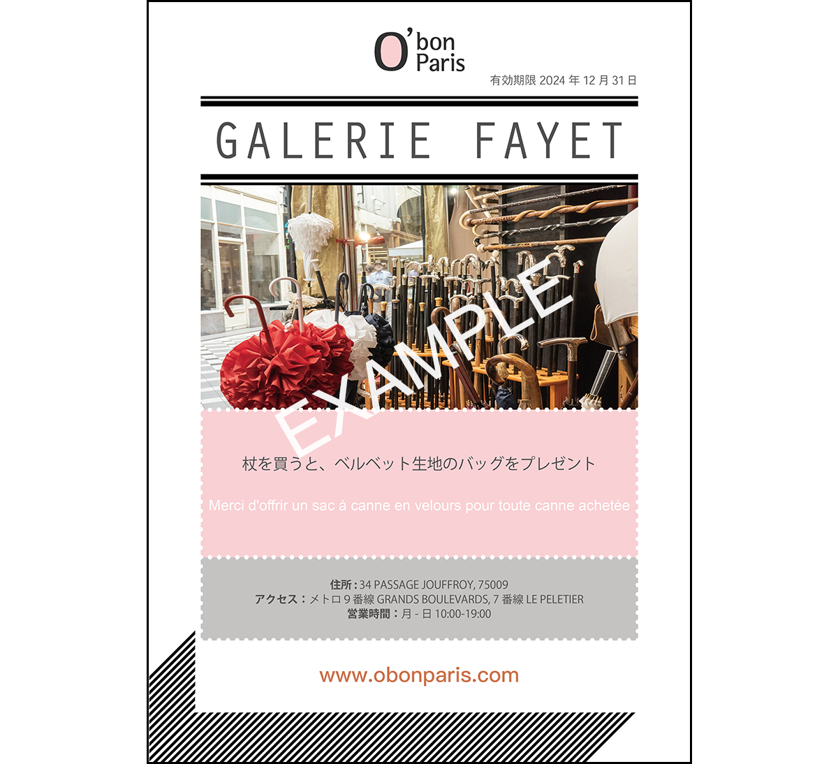 Galerie Fayetはフランス製の伝統的な杖です。1909年に創設されて以来、パリでずっと売られてきました。O'bon Parisのクーポンを使うとベルベットの限定バッグが無料でついてきます。
