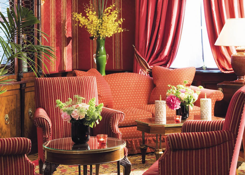 赤い壁紙、ベルベットの質感、インテリアはエレガントかつ温かみがあります。
