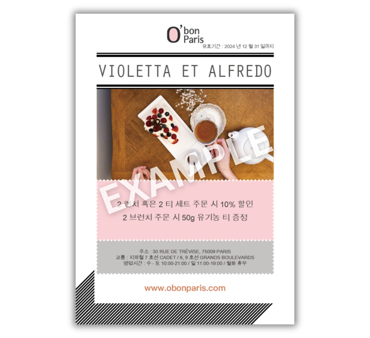 Violetta et Alfredo에서 브런치 세트를 2인 이상 주문하면 50g의 유기농 티를 제공하며 2인 이상의 티타임 세트, 점심식사, 저녁식사를 주문하면 10% 할인 혜택을 받으실 수 있습니다.