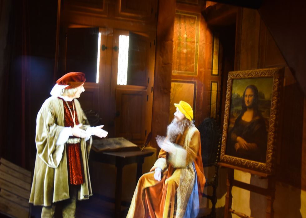 ภายในห้องสตูดิโอ มีการจัดแสดงด้วยเทคโนโลยี ''Peber Ghost'' หรือ การใช้โปรเจคเตอร์ฉายภาพเสมือนจริงดังเช่นในรูปด้านบน ด้วยเทคโนโลยีนี้ ผู้ที่มาเยี่ยมชมจะได้ทำความเข้าใจกับเรื่องราวชีวิตของดาวินชีมากขึ้น การแสดงภาพเสมือนจริงในสตูดิโอคือ ภาพเลียนแบบการนำเสนอผลงาน The Mona Lisa, The Virgin and Child and Saint. Anne และ St. John the Baptist ต่อหน้า ขุนนางแห่งราชอาณาจักรอารากอน (Aragon)