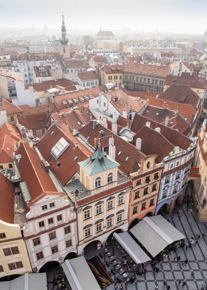เมื่อขึ้นไปถึงด้านบนจะพบกับประตูที่เปิดออกไปสู่ระเบียงชมวิวด้านนอกที่มีวิวของกรุงปรากแบบ 360 องศา สิ่งแรกที่จะเห็นเลยก็คือจัตุรัสเมืองเก่าที่เต็มไปด้วยตึกรามบ้านช่องที่มีหลังคาสีส้มอิฐเป็นเอกลักษณ์ บ่งบอกถึงความเป็นกรุงปรากได้เป็นอย่างดี เป็นเหมือนการบอกคุณไปในตัวว่าคุณได้มาถึงกรุงปรากอย่างสมบูรณ์แบบแล้ว