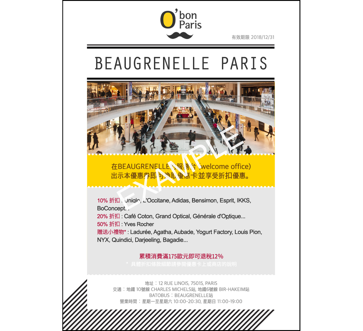 - 在BEAUGRENELLE購物可以享有指定店家的優惠與總累積消費超過175.01歐元可退稅12%。