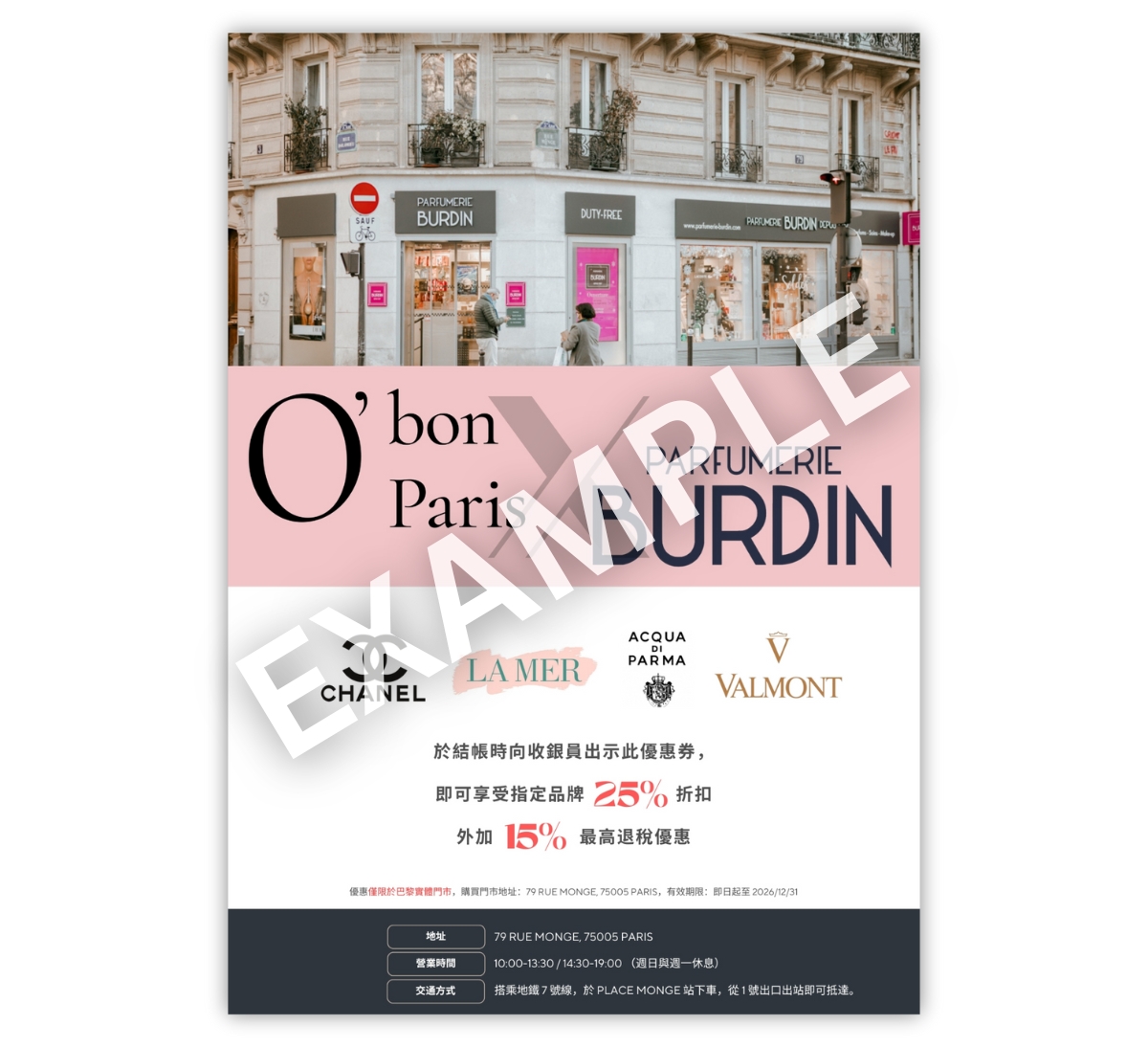 Burdin是一家由家族經營的法國香水店,創建於1937年。您可以在這裡找到最知名品牌(香奈兒、迪奧、嬌蘭、倩碧、YSL、蘭蔻、雅詩蘭黛、資生堂……)的香水、化妝品和護膚品。店內人員會根據您的個人要求幫您挑選最適合您的產品。下載您專屬的O’bon Paris優惠券,可立即享受 Chanel 香奈兒、 La Mer 海洋拉娜、Acqua di Parma 帕爾瑪之水及瑞士頂級護膚品牌 Valmont 25%的折扣。店內已經打折的商品不可重複打折。每次消費時,您還可以獲得免費的樣品或小禮物。