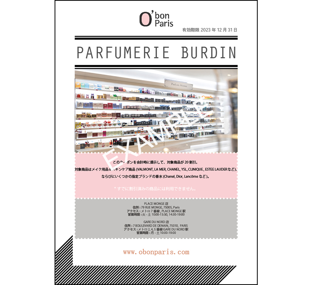 Burdinは、1937年創業のフランスの家族経営の香水店。このお店では、Chanel, Dior, Guerlain, Clinique, YSL, Lancome, Estée Lauder, Shiseidoなど人気ブランドの香水、メイク用品、スキンケア化粧品など幅広く取り揃えています。