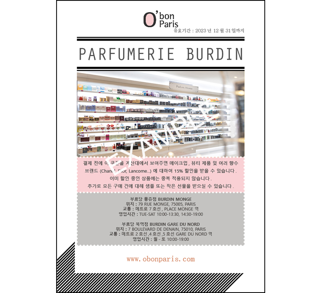 부르당 Burdin은 1937년에 만들어져 가족 대대로 노하우를 전해내려 온 파리의 전통있는 향수 부티크 입니다. 부르당에서 명품 뷰티 브랜드들 (샤넬, 디올, 겔랑, 클리니크, 생로랑, 랑콤, 에스티로더, 시세이도..) 의 향수, 메이크업 및 스킨케어 제품들을 만나보실 수 있습니다. 각 개인에게 맞는 퍼스널한 조언과 서비스를 받으실 수 있는 공간입니다. O'bon Paris 쿠폰을 다운로드하여 지정된 향수 브랜드(샤넬 Chanel, 아쿠아디파르마 Acqua di Parma)와 스킨케어 브랜드 (라메르La Mer, 발몽Valmont) 제품들 25% 할인 받으세요. 쿠폰을 제시하시면 또한 모든 구매 건에 대해 샘플이나 작은 선물을 받으실 수 있습니다. 이미 할인 중인 프로모션 품목에는 할인이 중복 적용되지 않습니다.