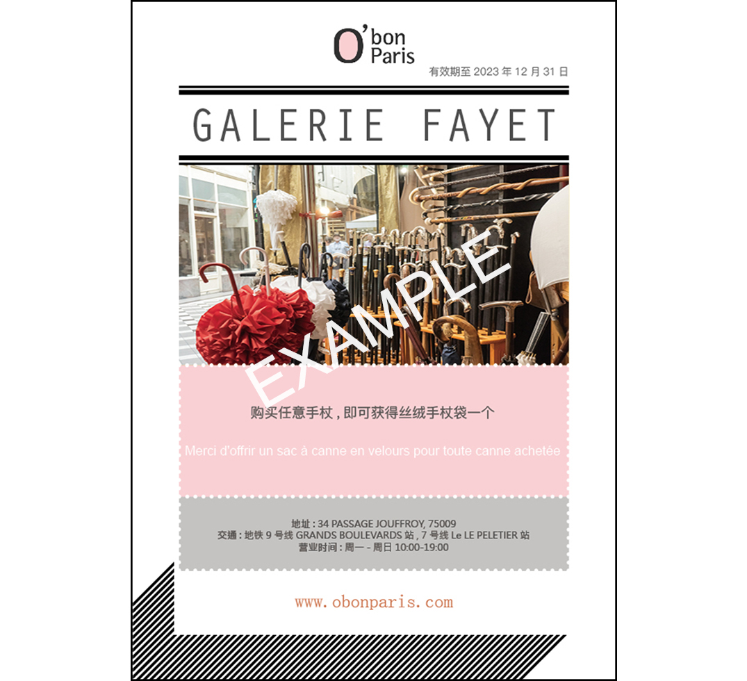 使用O'bon Paris优惠券,您购买任意一根手杖就可以获得一个免费的天鹅绒包。