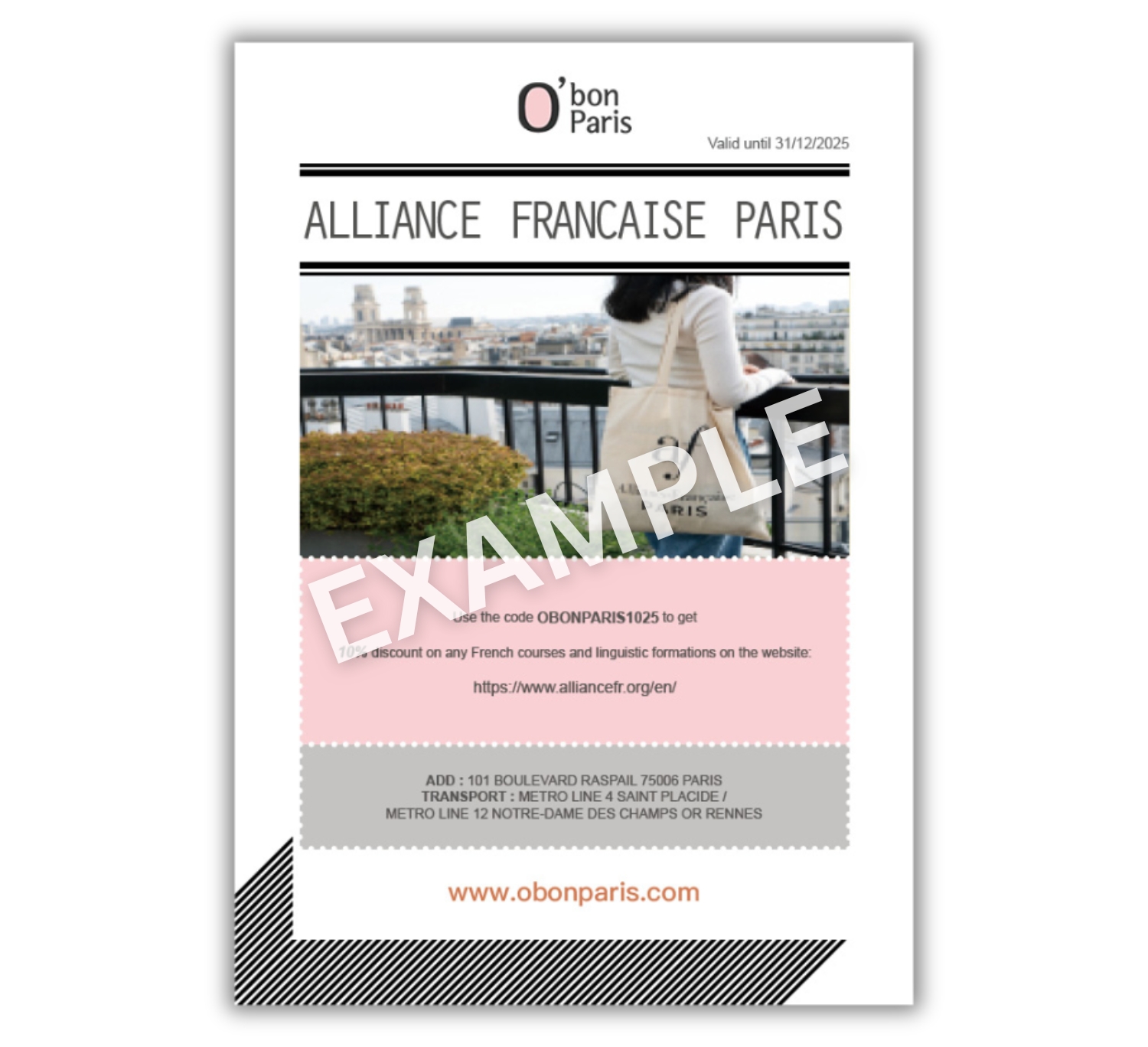 With the Promo code OBONPARIS1025, enjoy a 10% discount on all French courses and linguistic formations, while registering on their official website: https://www.alliancefr.org/en/