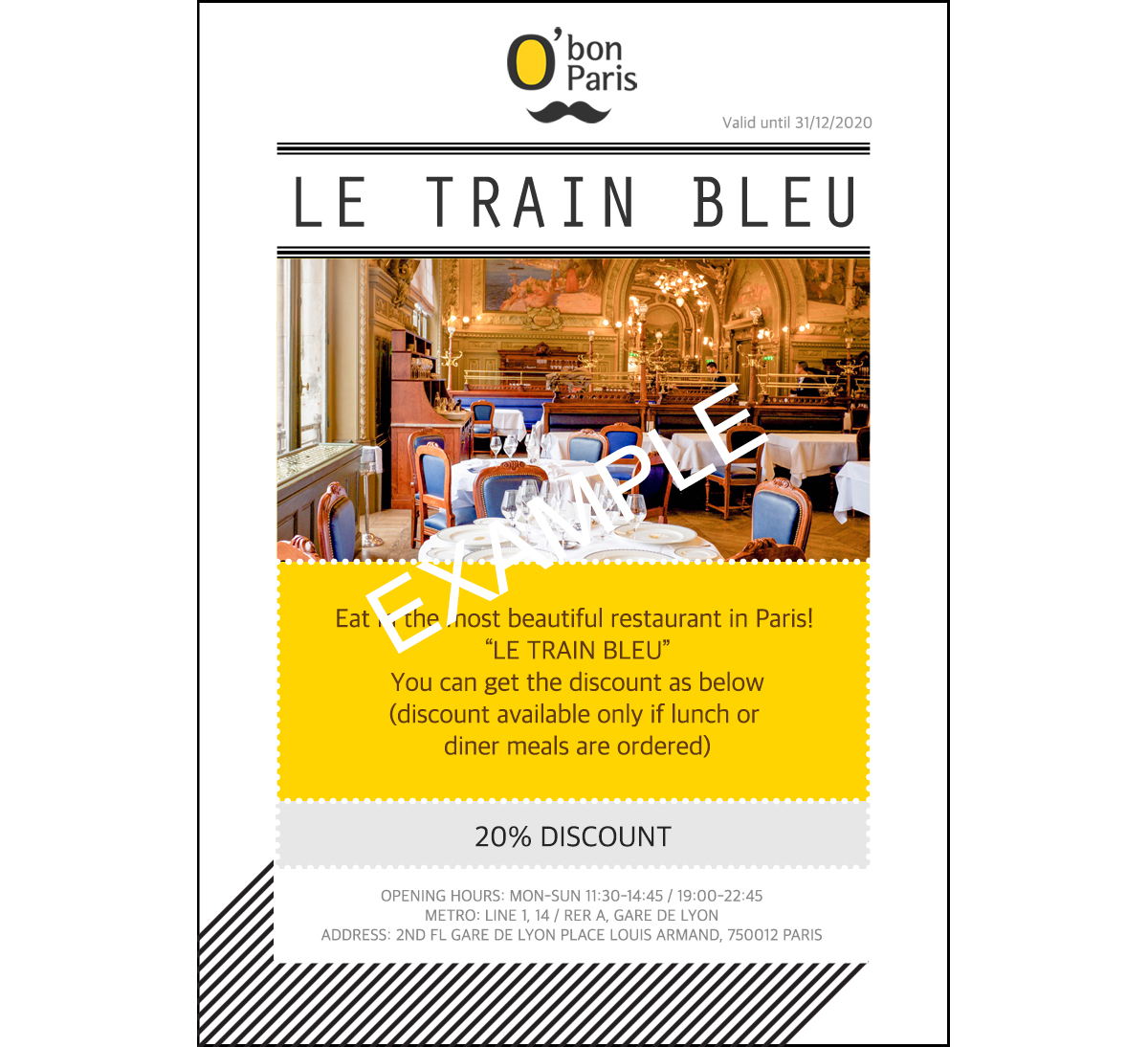 -For special events (Dinner on December 24, Lunch & Dinner on December 25, Diner on December 31st, Lunch & Dinner on January 1st, and Diner on February 14), the coupon O'bon Paris will not be accepted.