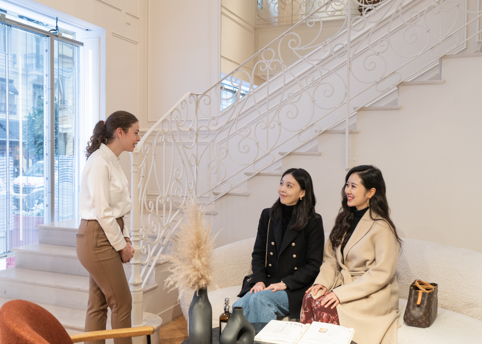 Nestled within a 19th-century elegant Haussmannian building, Maison Cible Skin features iconic Burgundy reds and graceful French curves symbolizing various skin forms. The moment you step in, you're captivated by the warm, delightful, and relaxing atmosphere of this French skincare heaven.