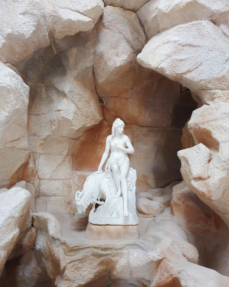 Hoping to win over the Queen and entice her to visit Rambouillet more often, Louis XVI secretly commissioned the construction of a luxurious laiterie d’agrément (a dairy designed for enjoying dairy products), which was unveiled to Marie-Antoinette and the court in 1787. The pavilion was built in the style of an ancient temple. The first room, shaped like a rotunda and crowned with a coffered dome ceiling, served as the space for tasting dairy products. Beyond a doorway lay the second room, known as the “cooling room,” where monumental rocks formed a grotto. In this grotto was placed Pierre Julien’s sculpture, Amalthea and the Goat of Jupiter. While strolling through the Rambouillet forest, you can easily envision the Queen and her dames de compagnie gracefully wandering amidst the serene beauty of the landscape.