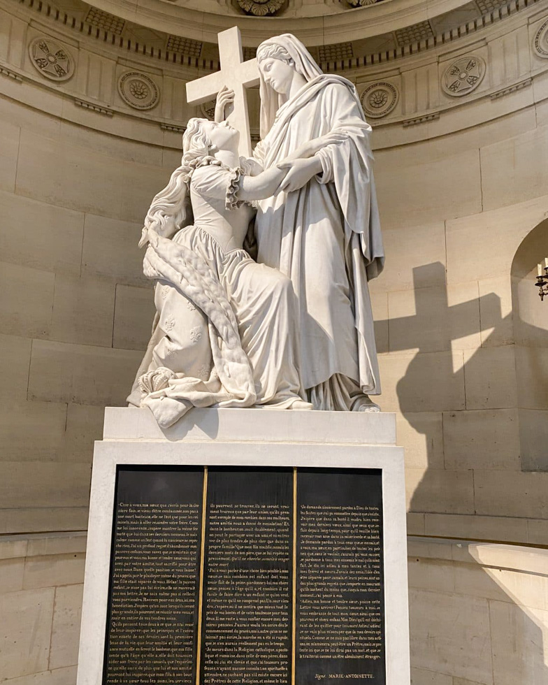 Following the Revolution, the remains of Louis XVI and Marie Antoinette were transferred to the Basilica of Saint-Denis on January 21, 1815, the anniversary of the King’s execution. A memorial, the Chapelle Expiatoire, was constructed between 1815 and 1826 on the site of the former revolutionary mass grave at the Madeleine Cemetery, where the royal couple had been interred after their deaths. Inside the Chapelle Expiatoire, visitors can view a poignant statue of Marie Antoinette kneeling before Religion, as well as her farewell letter to Madame Élisabeth, engraved in black marble.