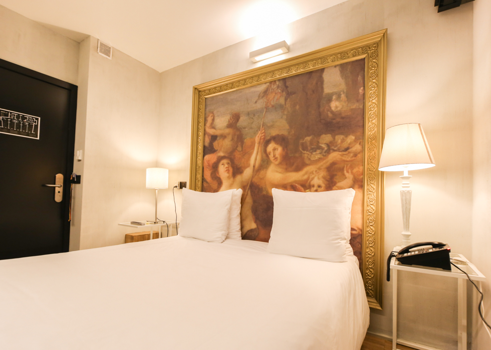 A unique point of this hotel is that they showcase a mix of designs by taking old masterpieces and either framing, or stretching them on the wall. Each of 33 rooms are different and unique, but all have a stylish and cool atmosphere and are modernized with black staple pieces.