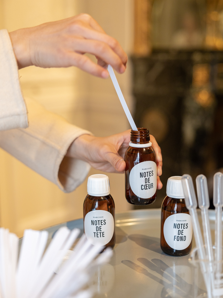 A bunch of small glass bottles placed in different fragrances tune the perfume composition, a wooden tone, floral tone ... and so on, you can guide the interpretation of the pilot under the test.