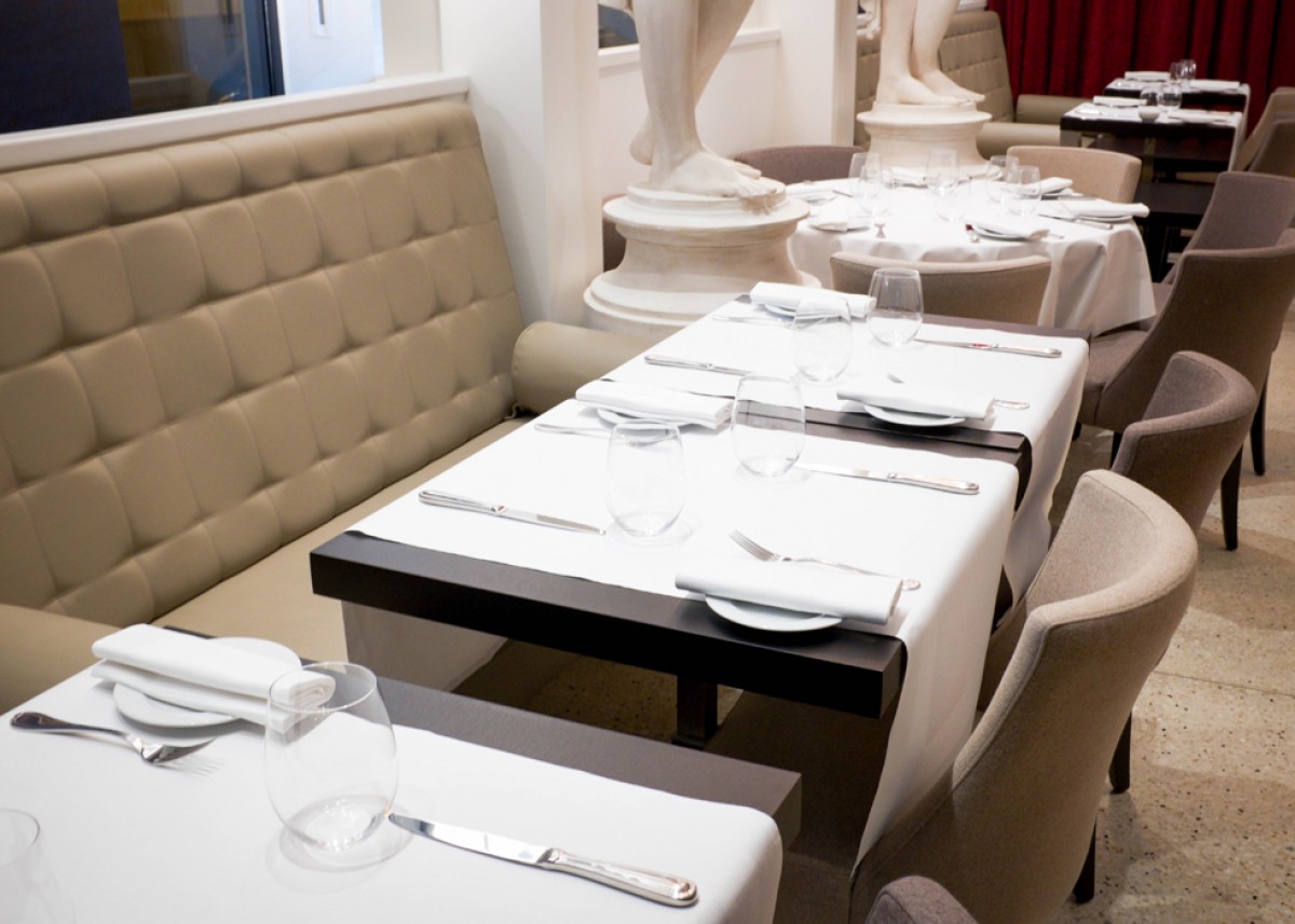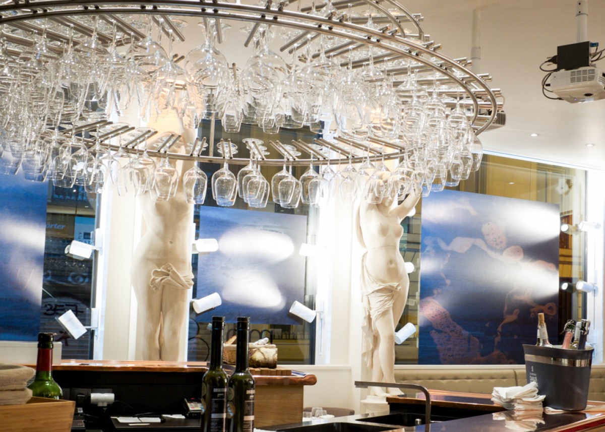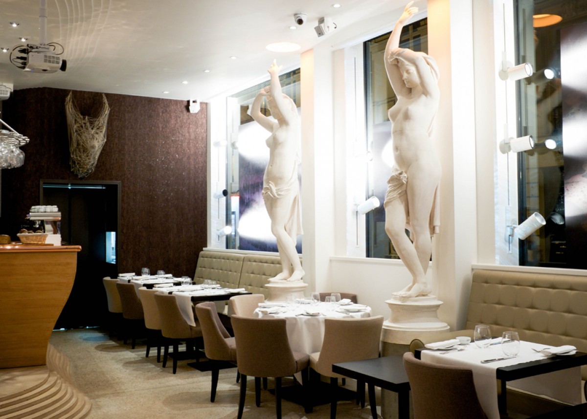 This restaurant creates an environment similar to a boat. During the evening, the curtains go down. The screens project the bank scenes of river Gironde situated in Bordeaux, accompanying with the chirps of birds and cicadas. A pleasant journey sets off and the beautiful scenes swift as the times goes by. On this imaginary boat, four statues of Caryatids (figures from the Greek and Roman mythology) are set inside. These female statues are the genuine replicates of those which are around the Opera Garnier. They are Goddess serving wines around the God of Wine, Bacchus. Their existence reminds us that this is a place providing good wines.