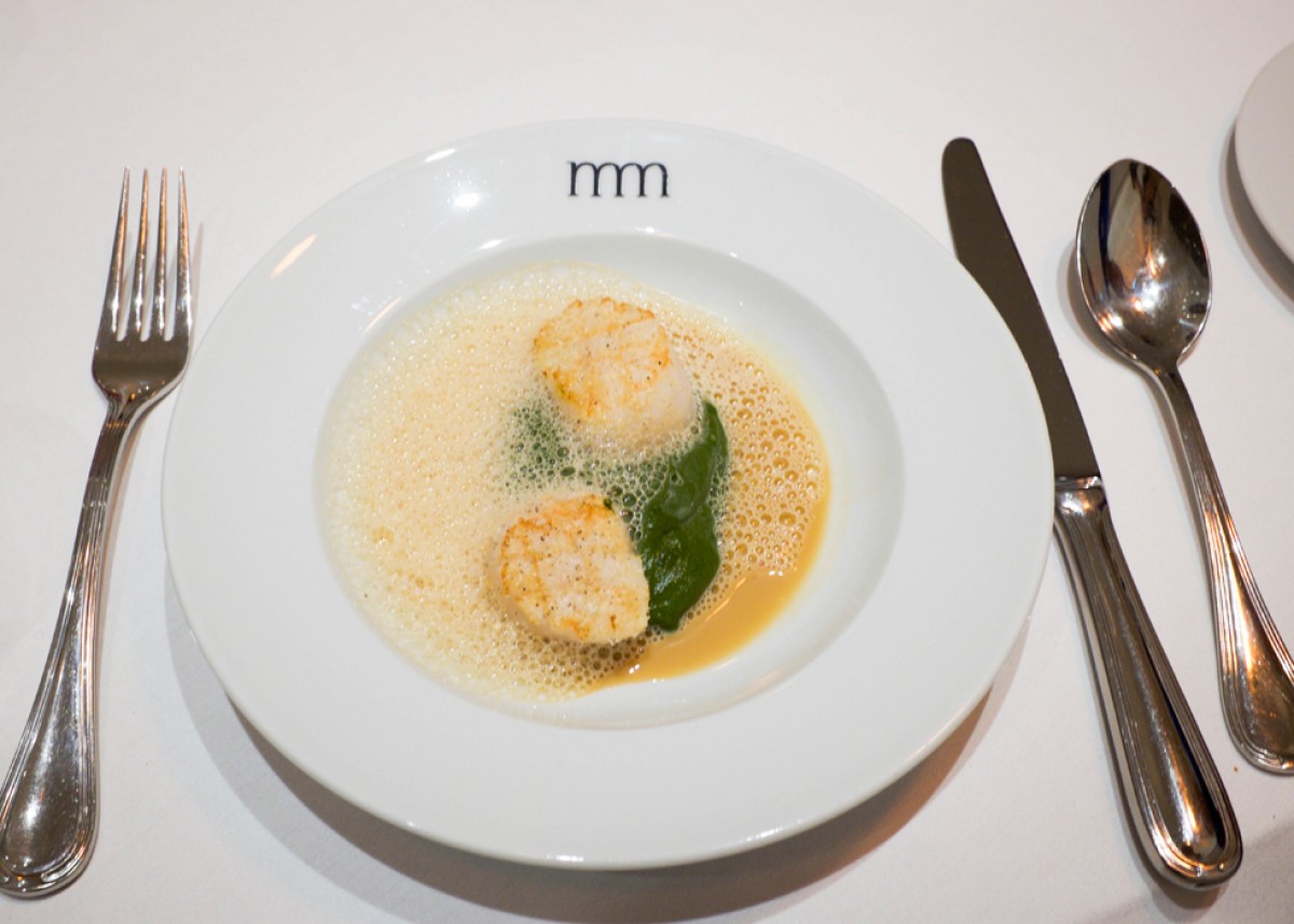 Nuts of St. Jacques of Port en Bessin, spinach, garlic and ginger emulsion (les noix de saint jacques du Port en Bessin, épinard, émulsion ail et gingembre)