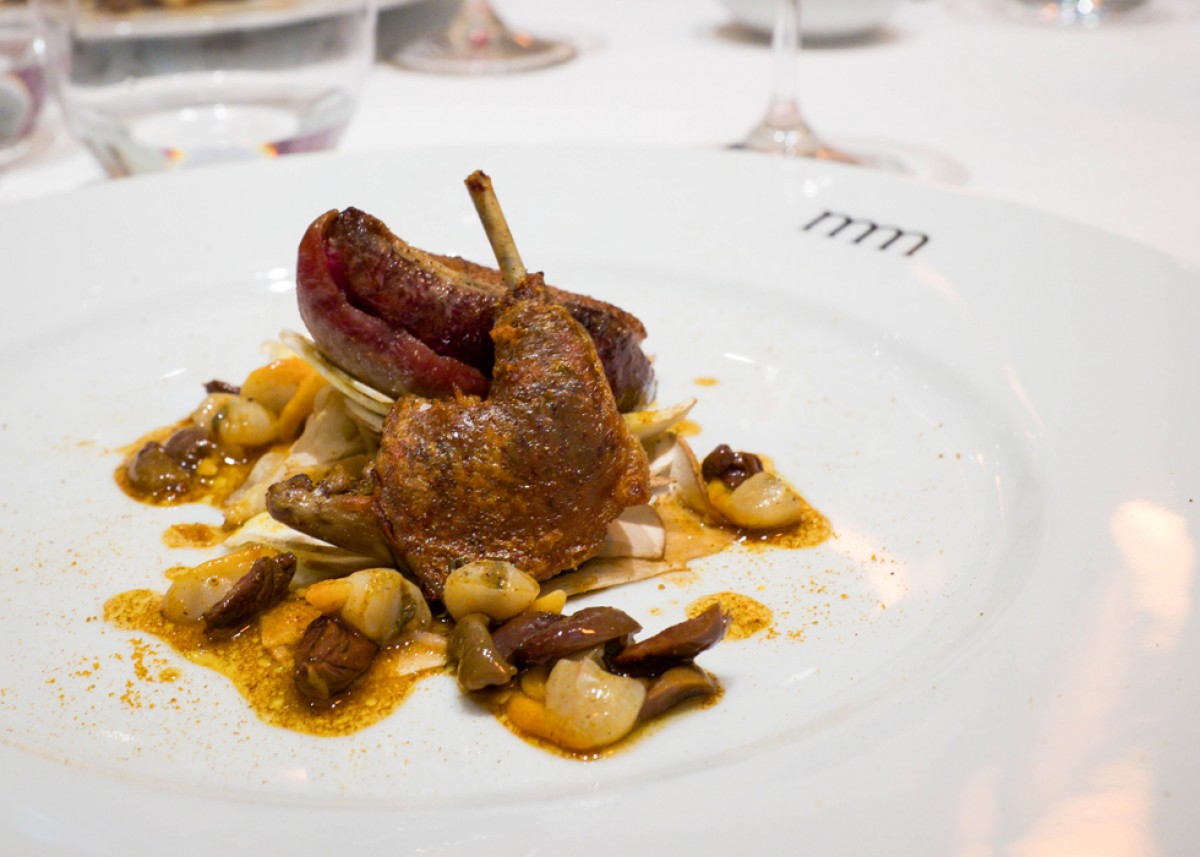 Pigeon and Confit duck, porcini mushrooms, nuts, olive and ras el hanout (le pigeon, la cuisse confite, cèpes, coque, olive et ras el hanout)