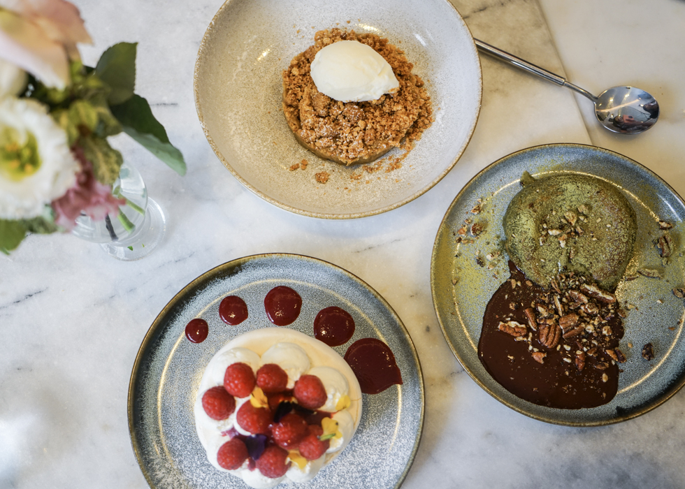 A divine dessert masterpiece. The pavlova adorned with luscious raspberries pairs flawlessly with mascarpone mousse, while the basil-infused red fruit coulis adds a refreshing finishing touch. Exquisite indulgence awaits.