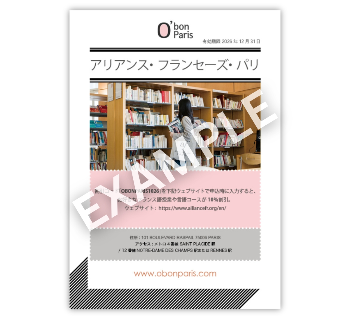 割引コード 「OBONPARIS1026」 を下記公式Webサイトで申し込み時に入力すると、すべてのフランス語コースと言語コースが 10%割引になります。