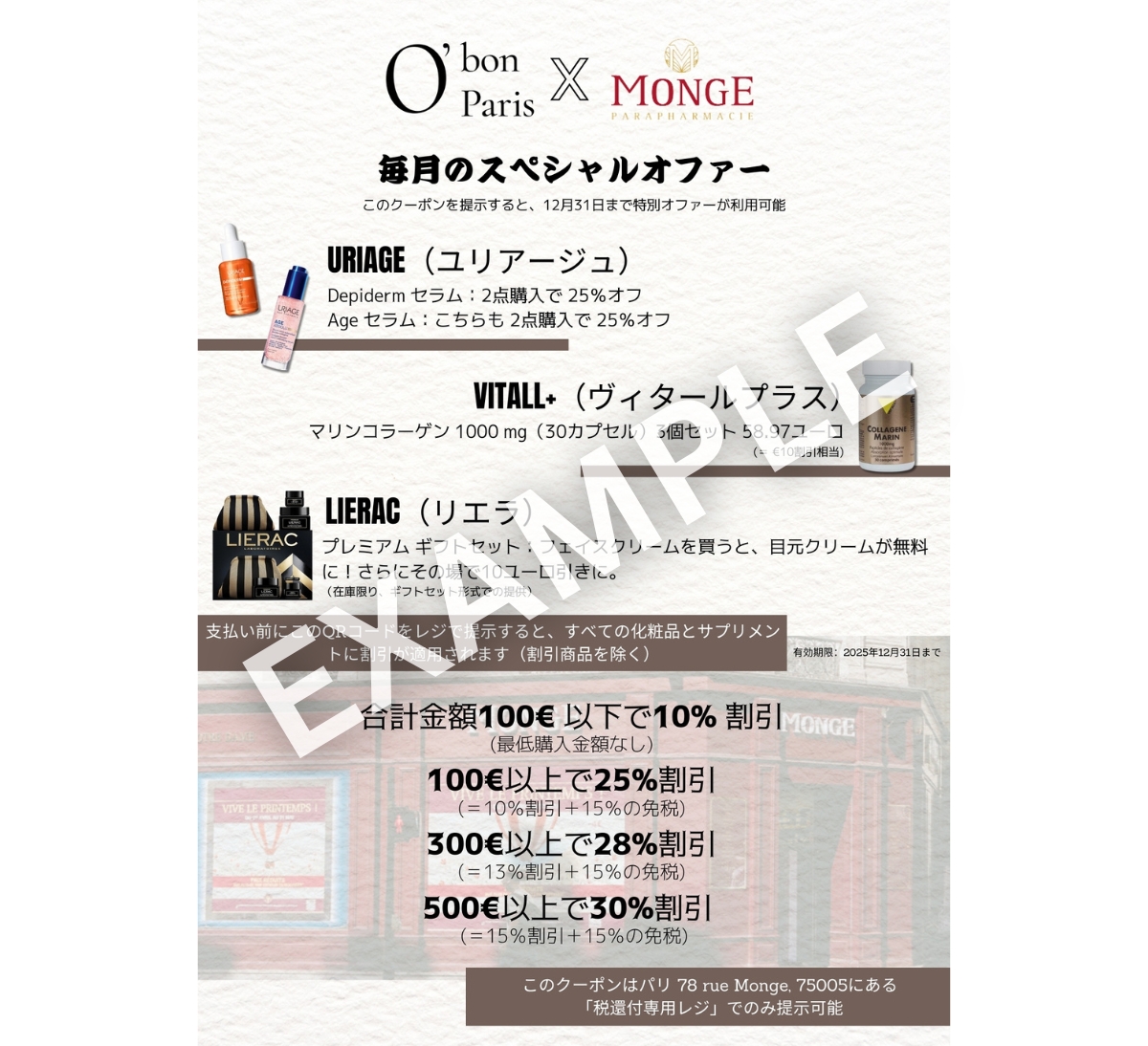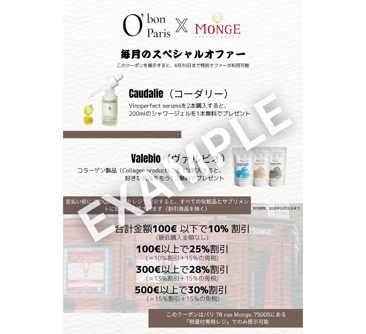 - モンジュグループでは、O’bon Parisの割引と併せて、100€以上のお買上げで15%の免税が適用されます。免税をご希望の場合はパスポートの原本(コピー不可)の提示が必要です。
