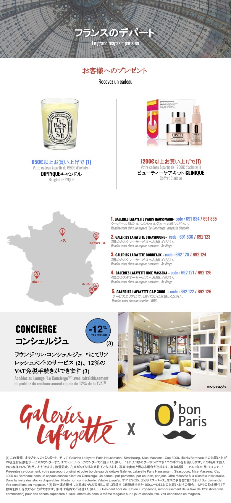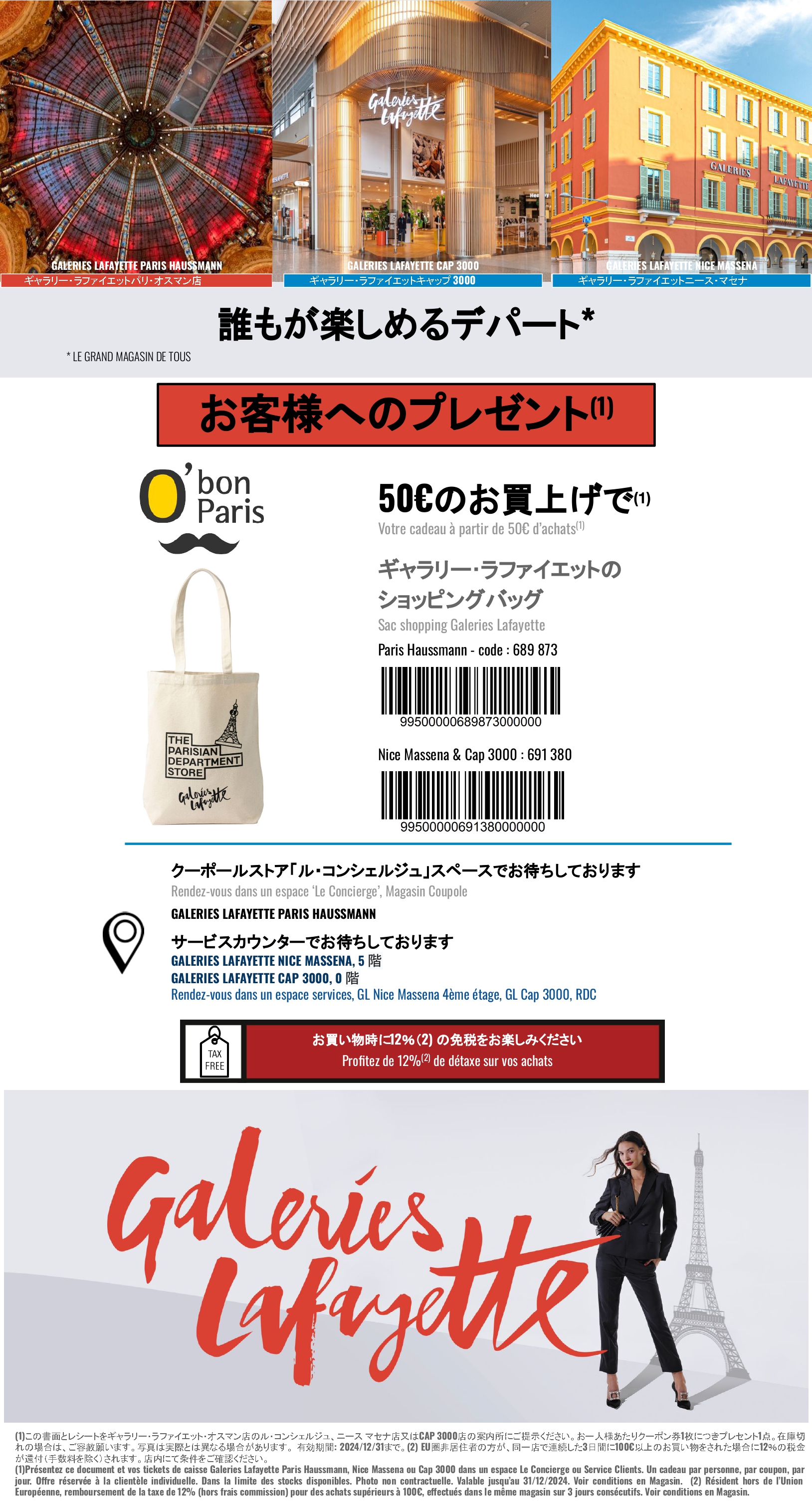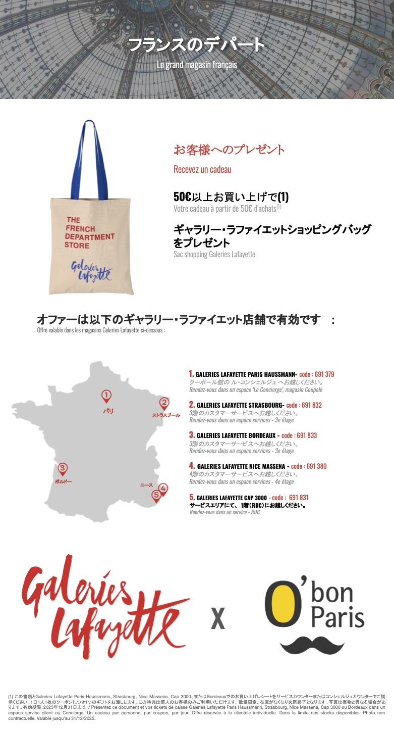 O’bon Parisクーポンを利用するとご購入金額に応じて様々なスペシャルオファーを楽しむことができます。この特典を楽しむにはお買い物時のレシートとこのページから画像保存したO'bon Parisクーポンをご提示ください。レシートは、ギャラリー・ラファイエットのレストランとカフェ以外のものすべてを組み合わせることができます。