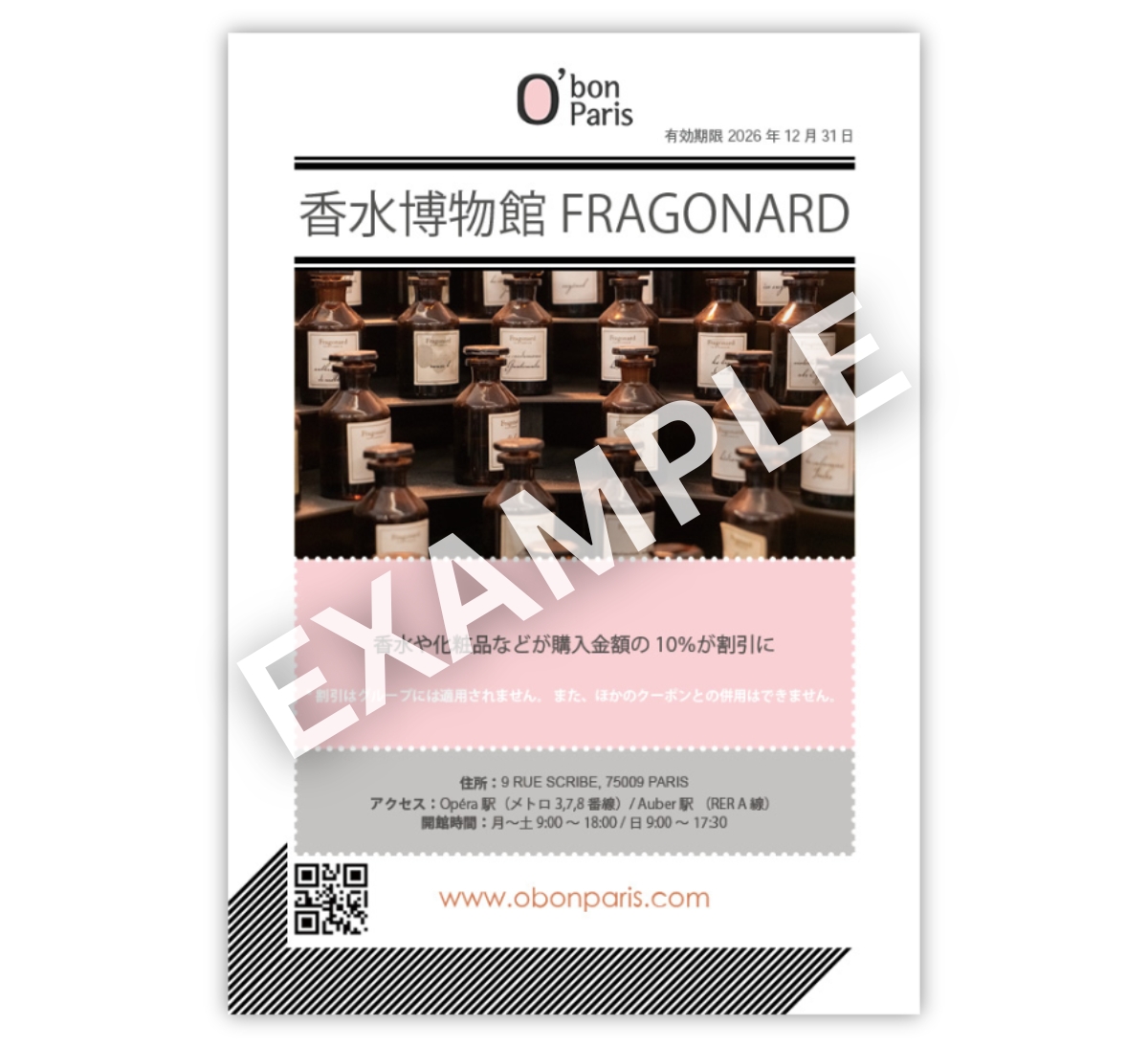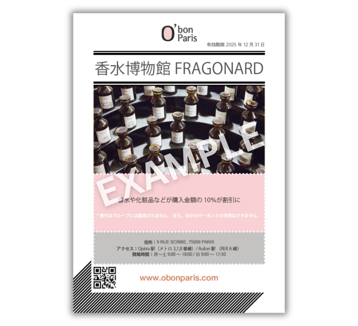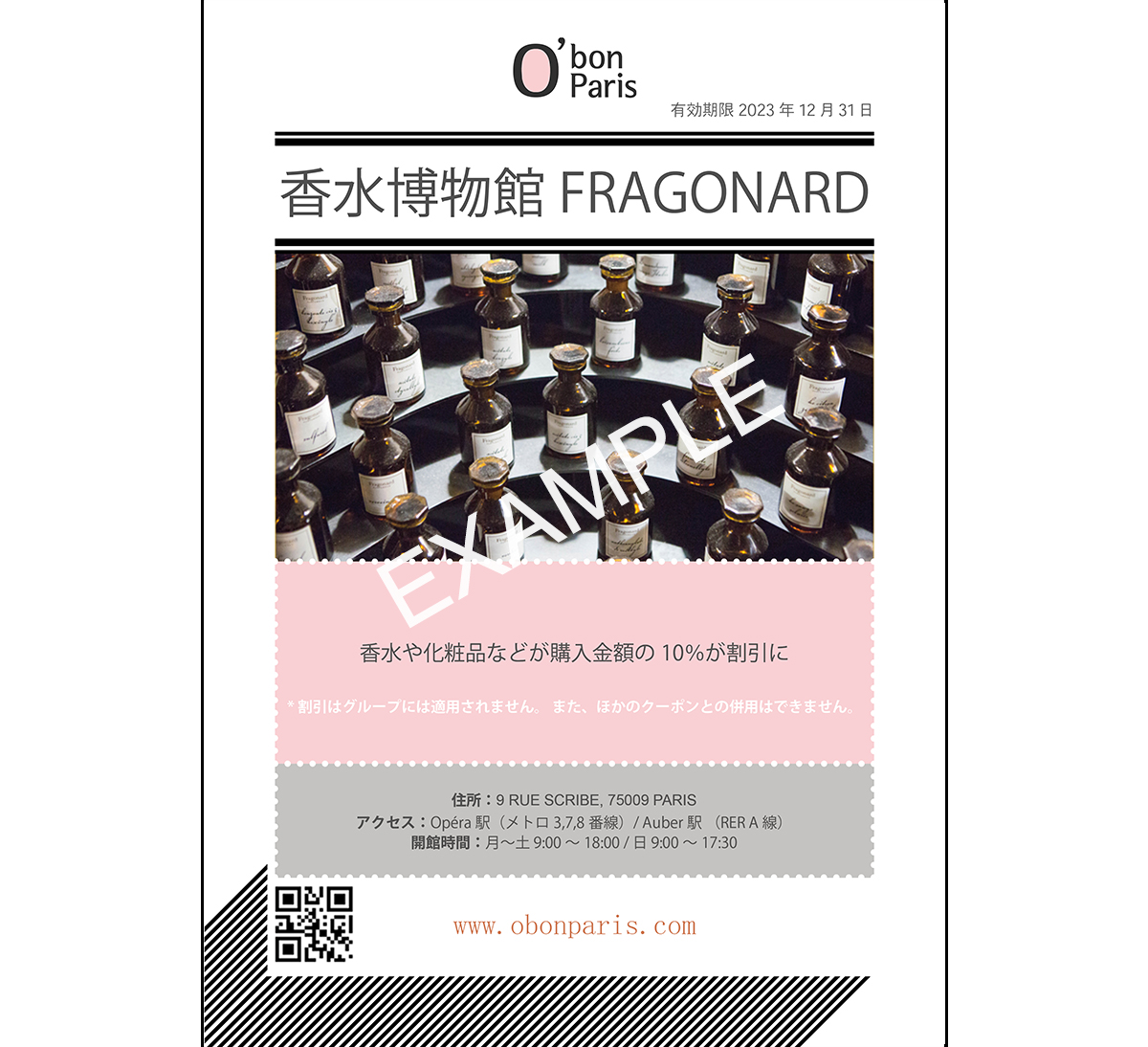 - 博物館付属のブティックにおける香水や化粧品の購入が10%割引になります。(ブティックの住所 : 3-5 square Louis Jouvet)