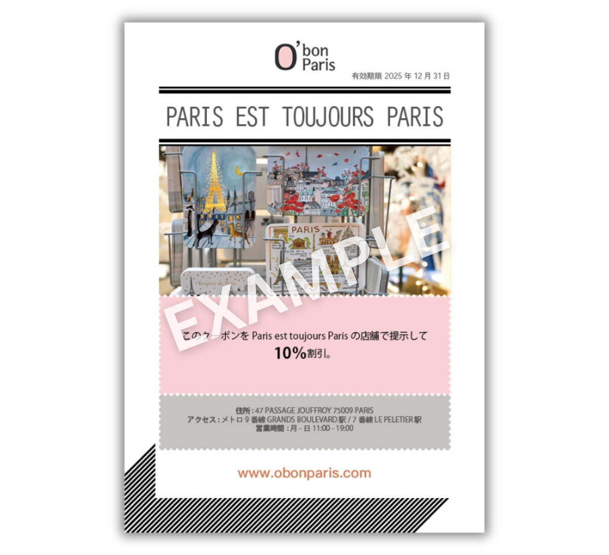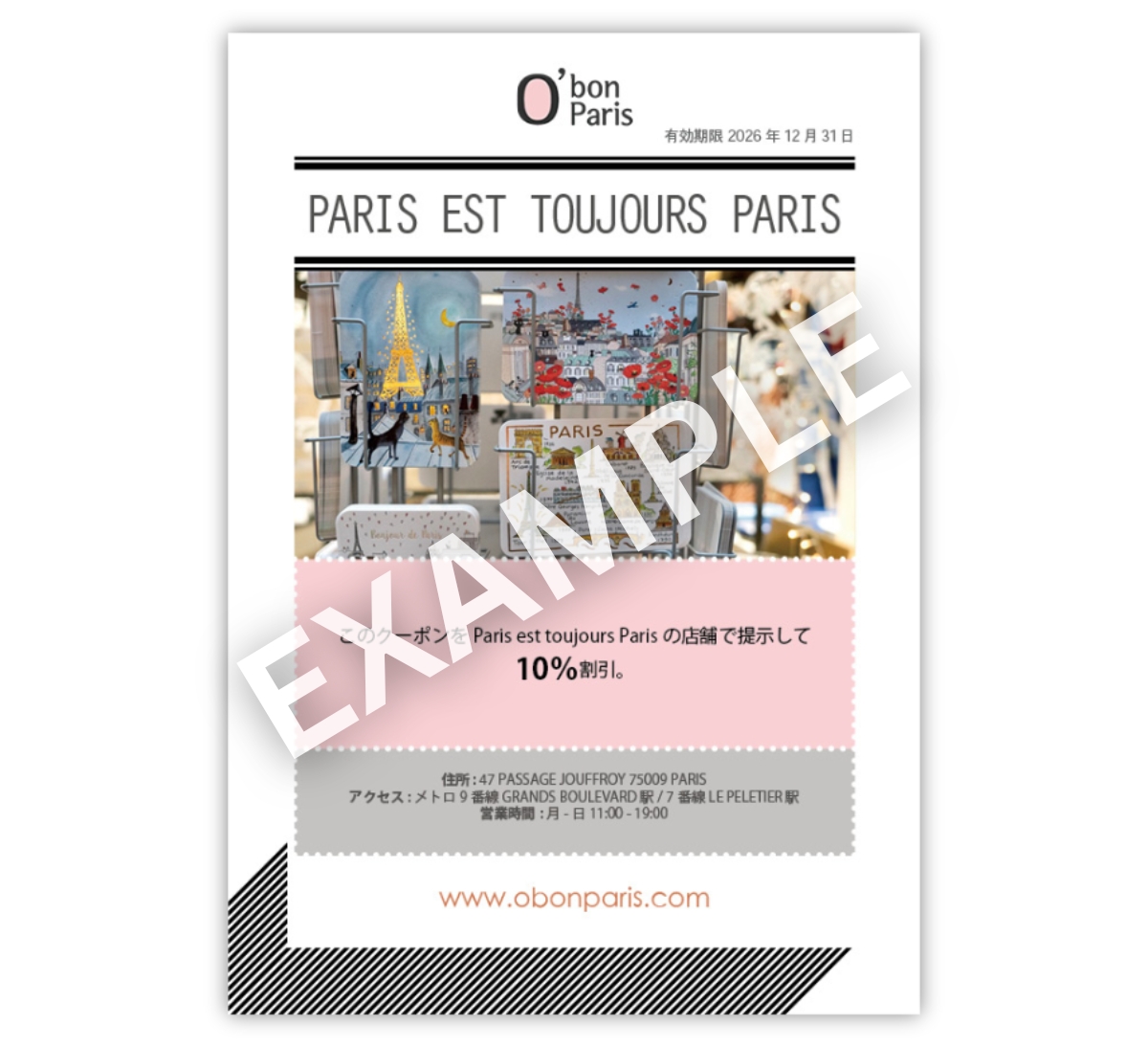 歴史あるパッサージュ・ジュフロワの中にあるお土産ショップ、Paris est toujours Paris。LAULHÈREのベレー帽やSaint Jamesのボーダーカットソーをはじめ、フランス製のお土産が豊富にそろいます。こちらのクーポンを使うと、お買い物時に10%割引が適用になります。