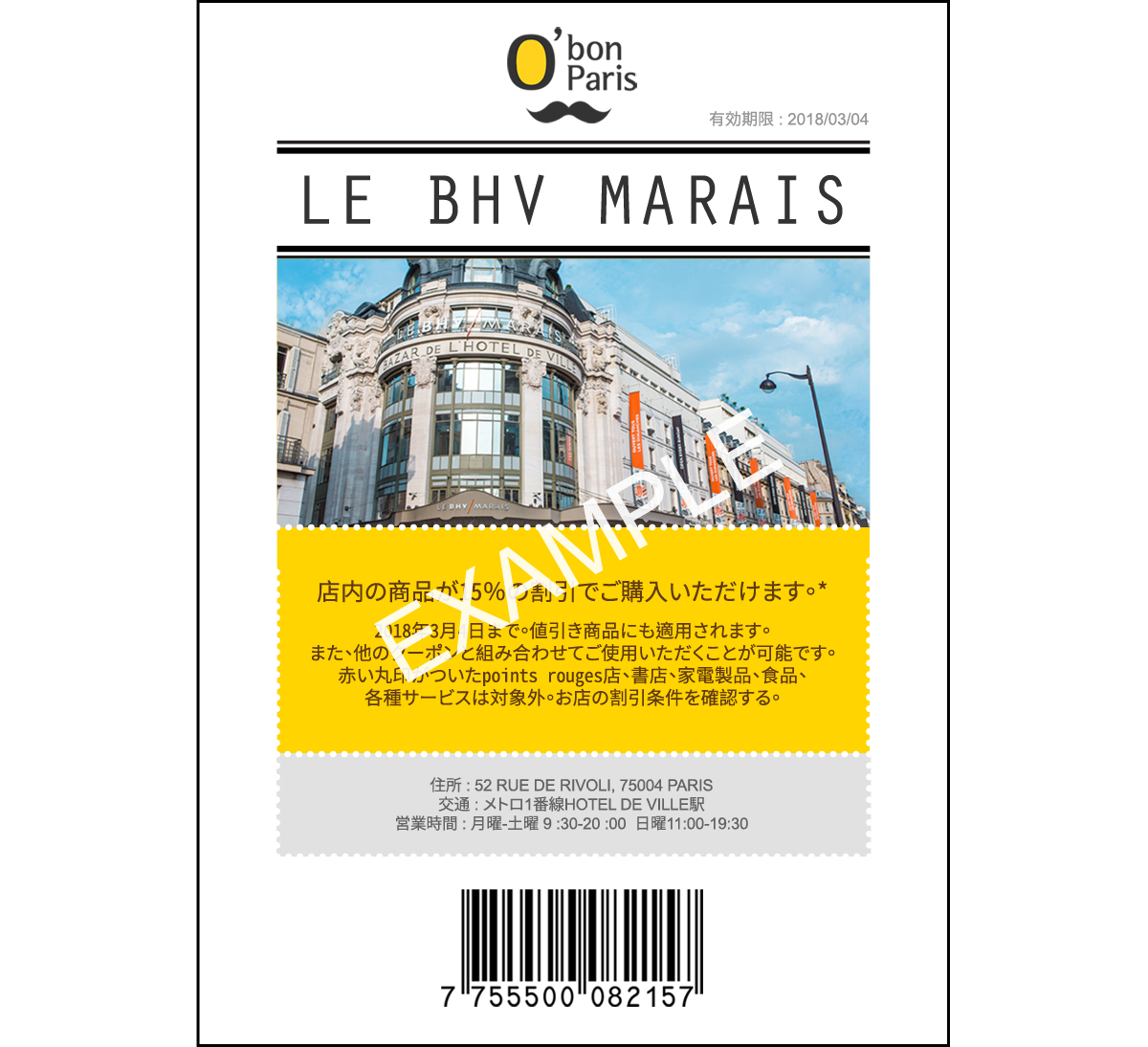 - LE BHV MARAISでのお買い物がクーポンのご利用で15%割引に。割引商品も対象となります。