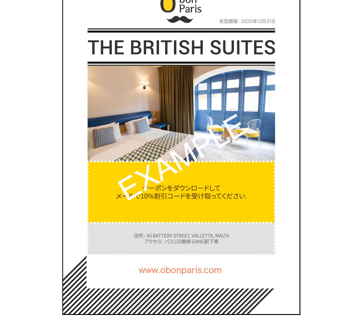 - 10%割引はThe British Suitesオフィシャルウェブサイトから予約時に、クーポンダウンロード時にメールで受け取ったO'bon Paris割引コードを入力すると適用されます。