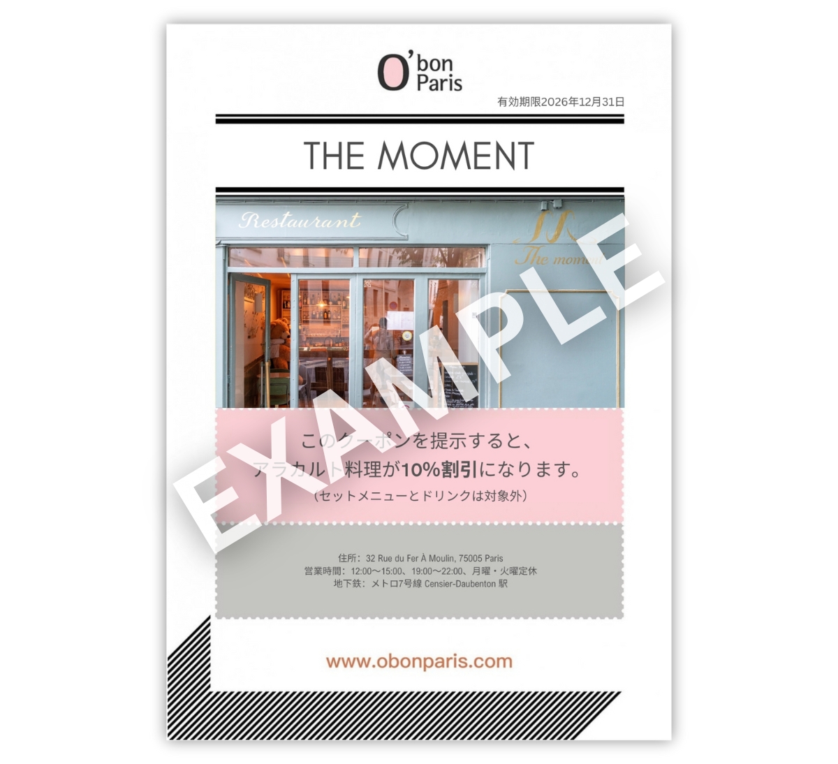 さらに、O’bon Parisのクーポンを利用すると、アラカルトメニュー(ドリンクを除く)が10%割引に。来店時にクーポンを提示するだけで利用できます。