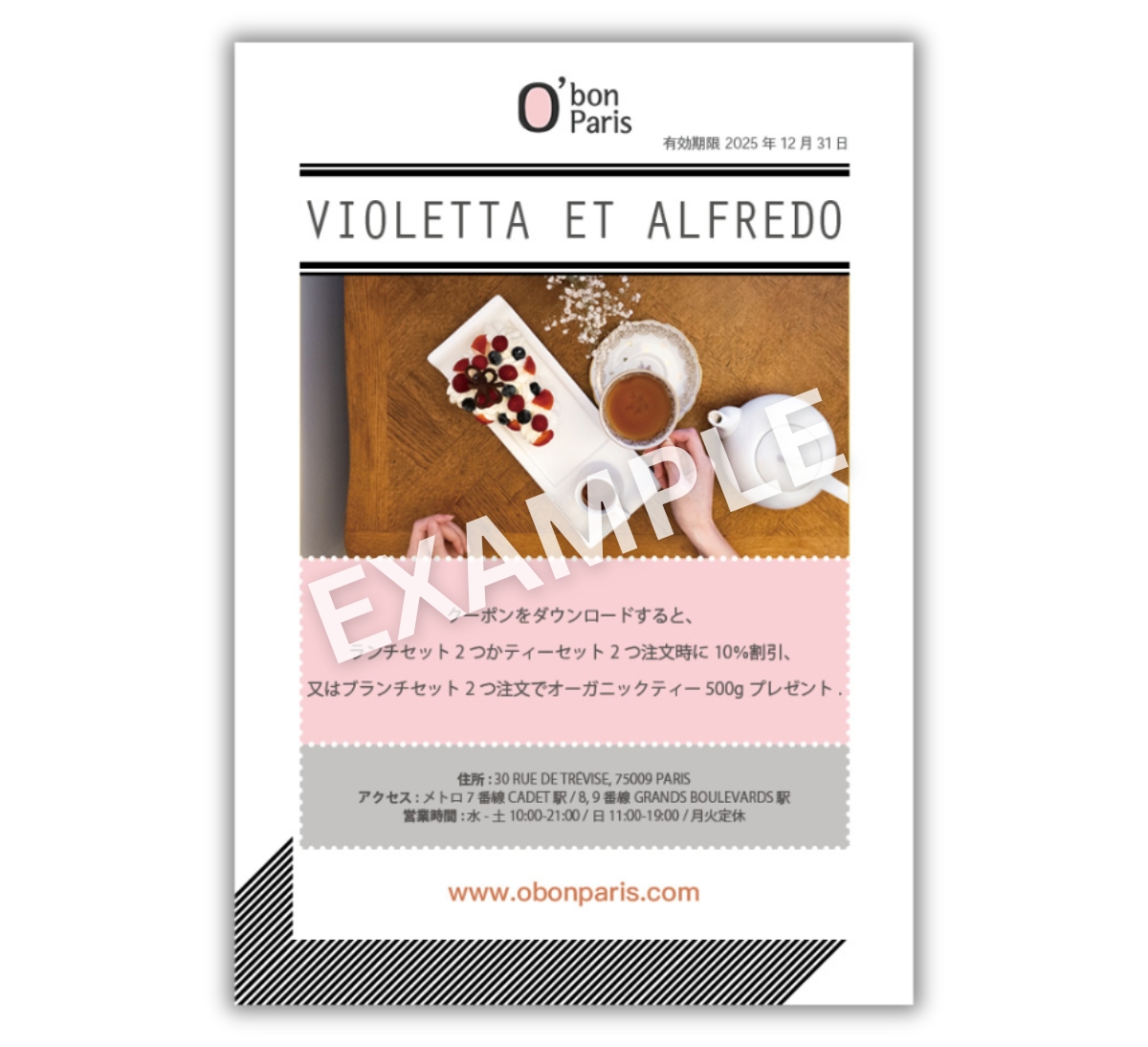 クーポンをダウンロードすると、ランチセット2つかティーセット2つ注文時に10%割引、又はブランチセット2つ注文でオーガニックティー50gプレゼントをゲットできます。