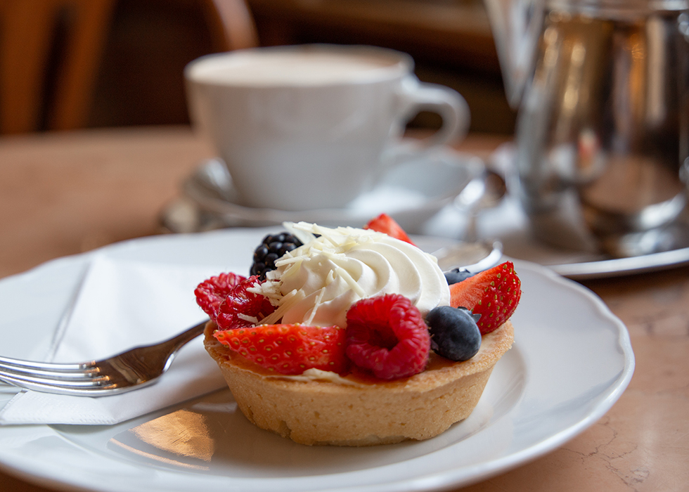 ケーキコーナーで選んできたフルーツタルト。イチゴ、ラズベリー、ブルーベリーなど爽やかなフルーツがたっぷり乗っています。コーヒーとクリームがとても合って美味しい。