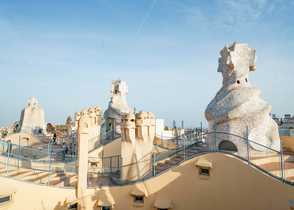 屋上はカサ・ミラのシンボルとも言える場所。空調の通気口はそれぞれ、火、空気、大地など様々な自然をモデルにした形です。ヘルメットをかぶった人間の形をした煙突は、カサ・ミラを守る者としてデザインされました。この煙突のデザインに、既にピンときた方もいるのでは?そう、これは映画「スター・ウォーズ」のダースベーダーのモデルになったと言われています。スター・ウォーズファンにとっても必見スポットですね!