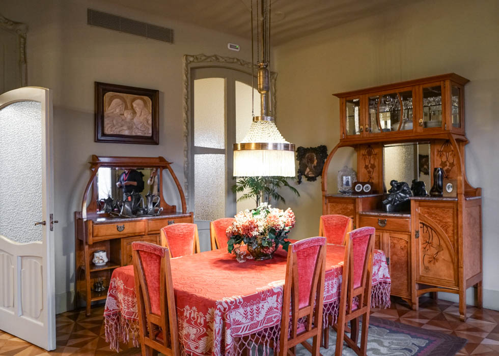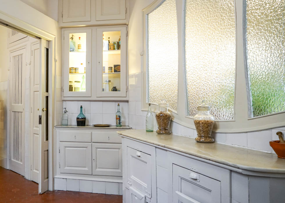 上の写真の展示室では、20世紀にカサ・ミラが完成した当初の建物内での生活の様子を見学することができます。このキッチンには当時の最もモダンな家具を用いたエレガントな装飾があしらわれています。木目を美しく組み合わせた床はリビングルームまで続いており、ドアを開けると大きな一つの部屋となるようにデザインされています。ガウディが利便性、空間の利用方法、生活動線を考えて設計した事がわかります。