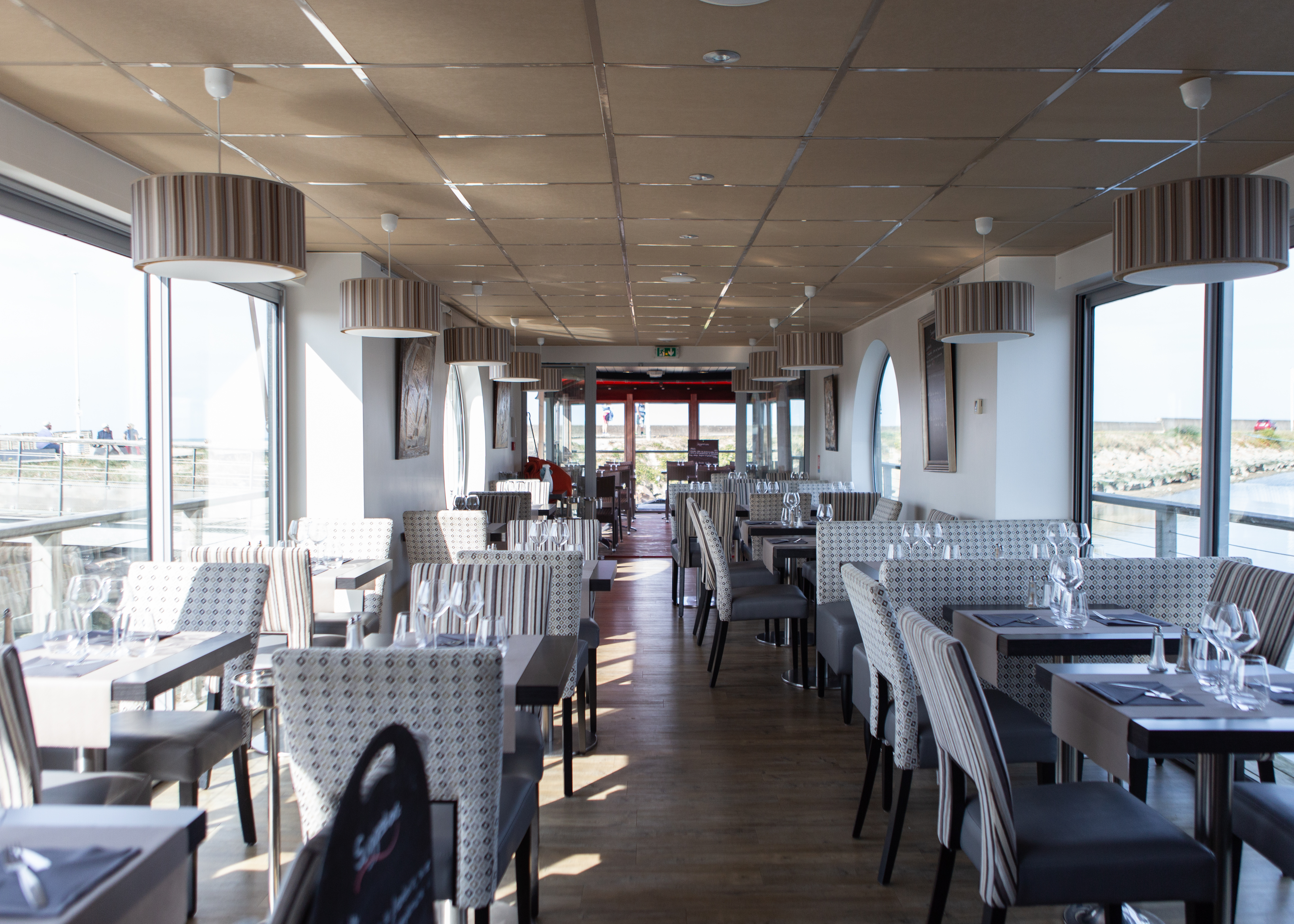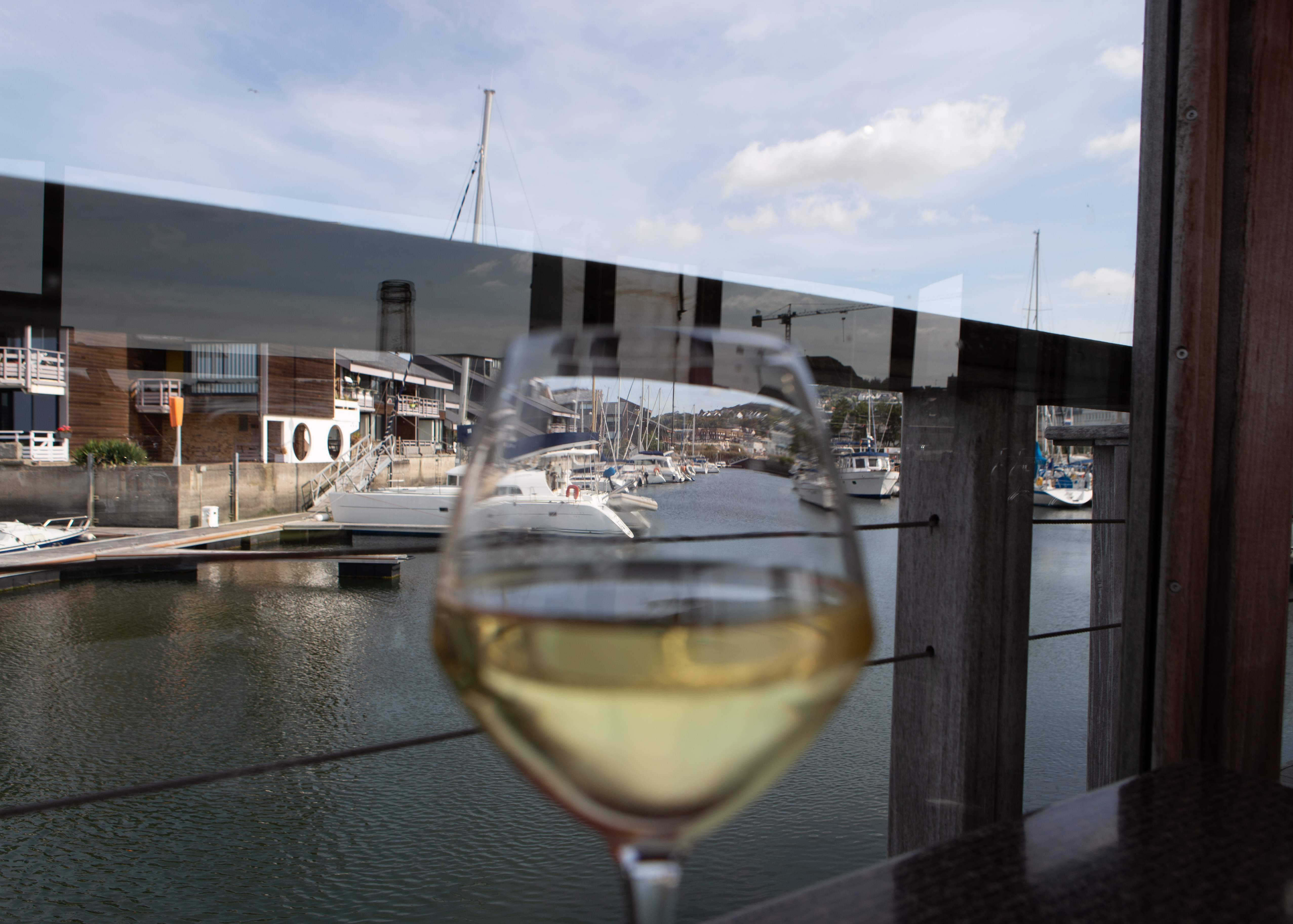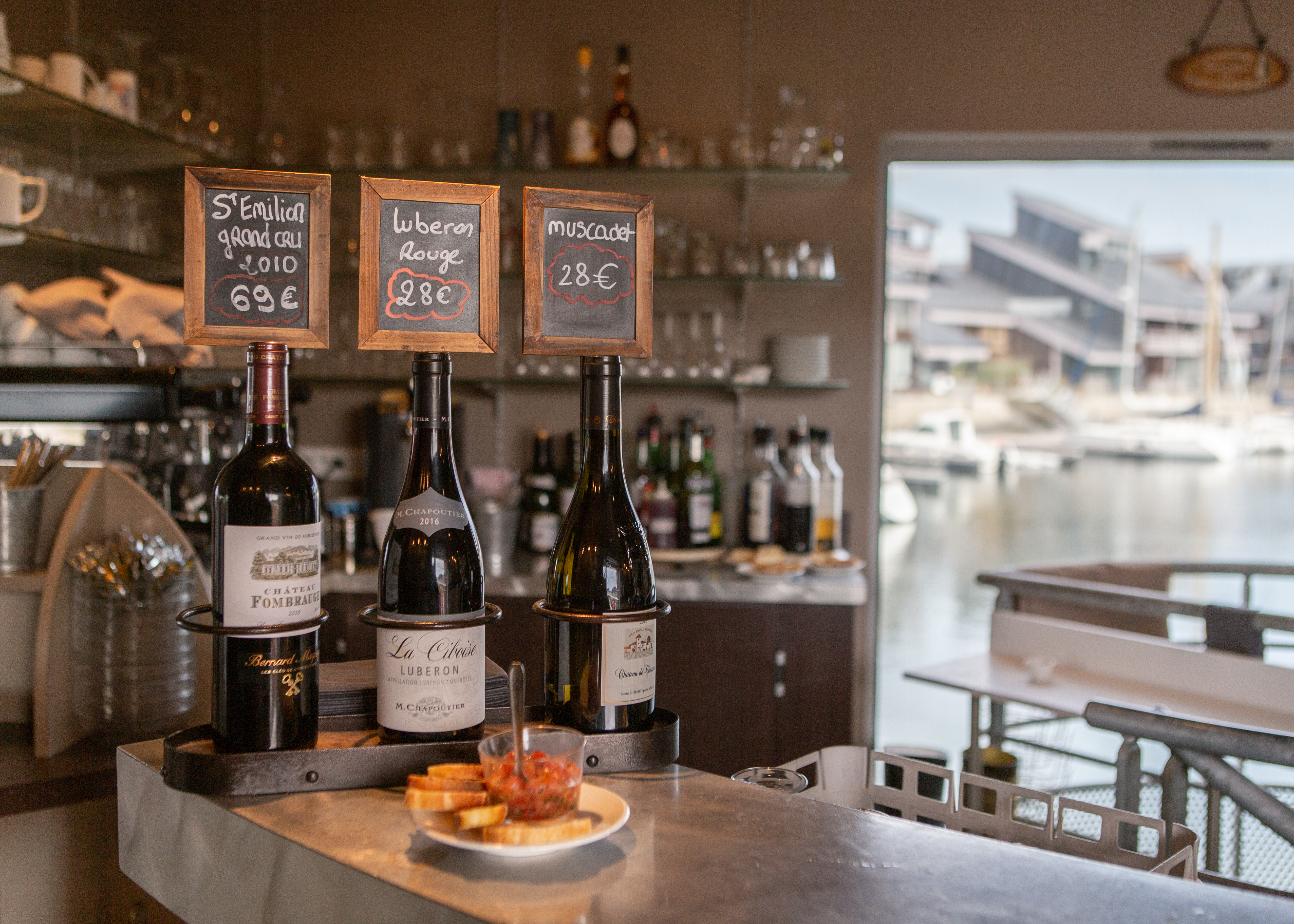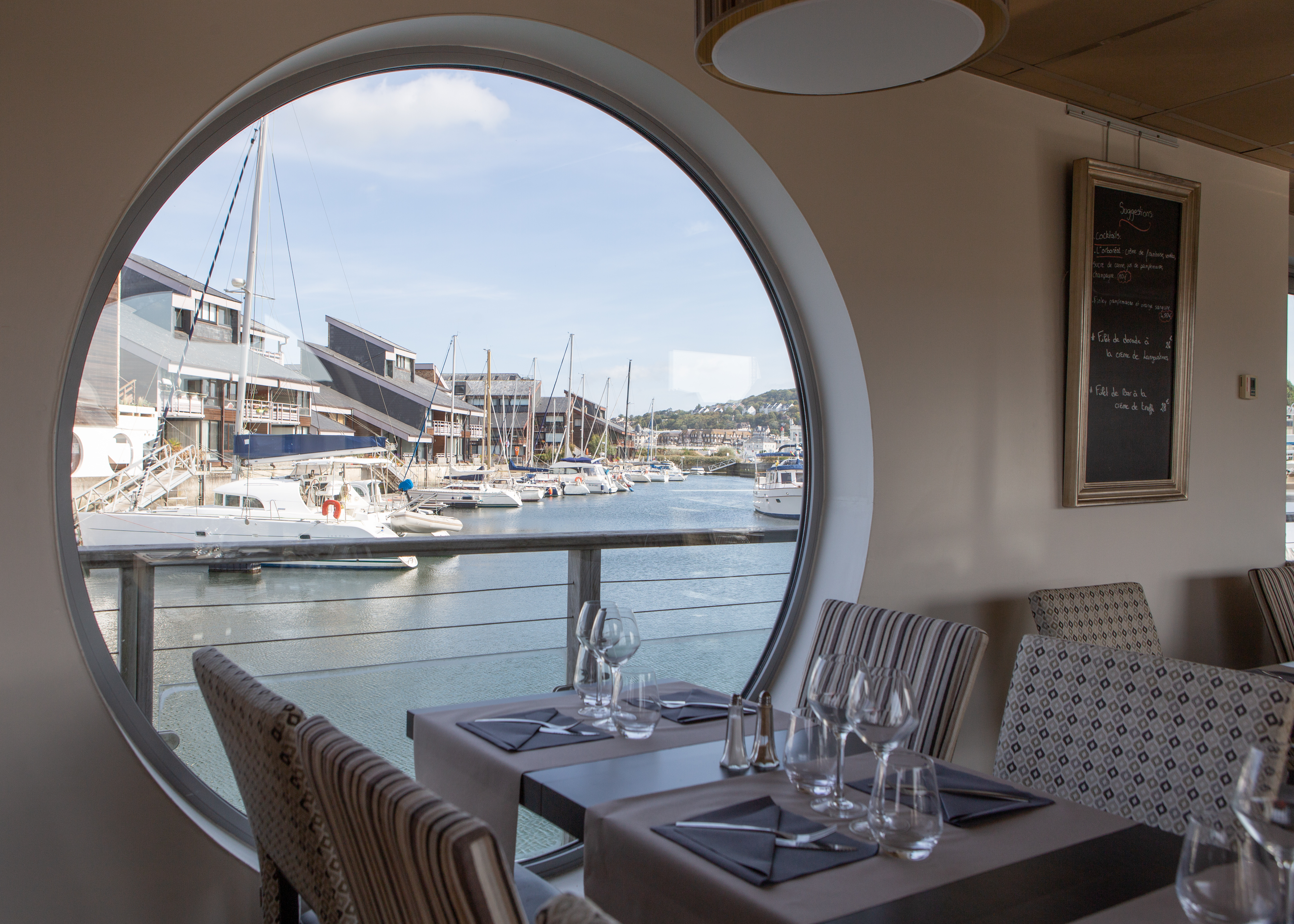 窓から港を眺められるこの素敵な席に座ります。
