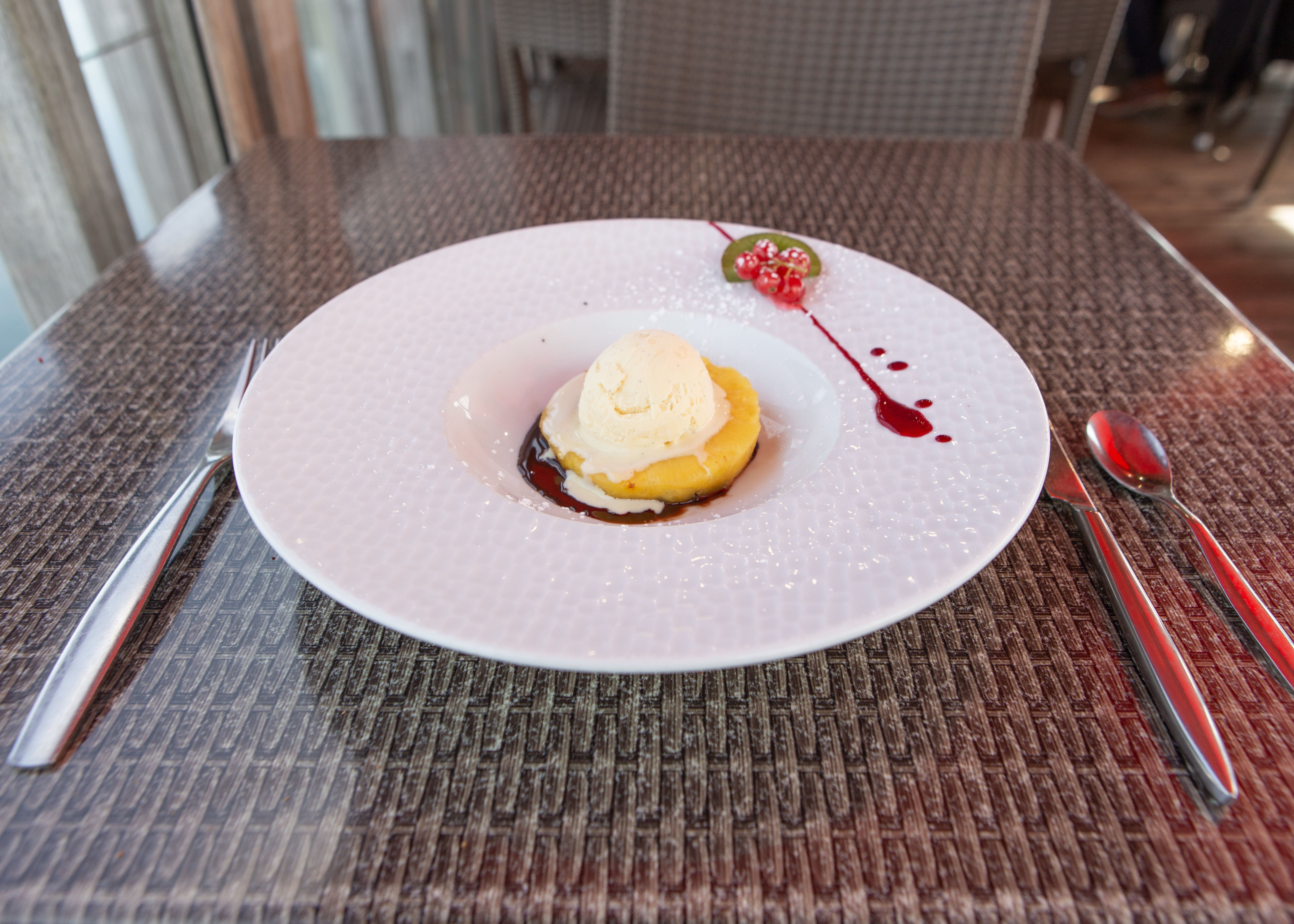 ANANAS FRAIS ROTI SUR FONDUE DE CHOCOLAT ET GLACE VANILLE