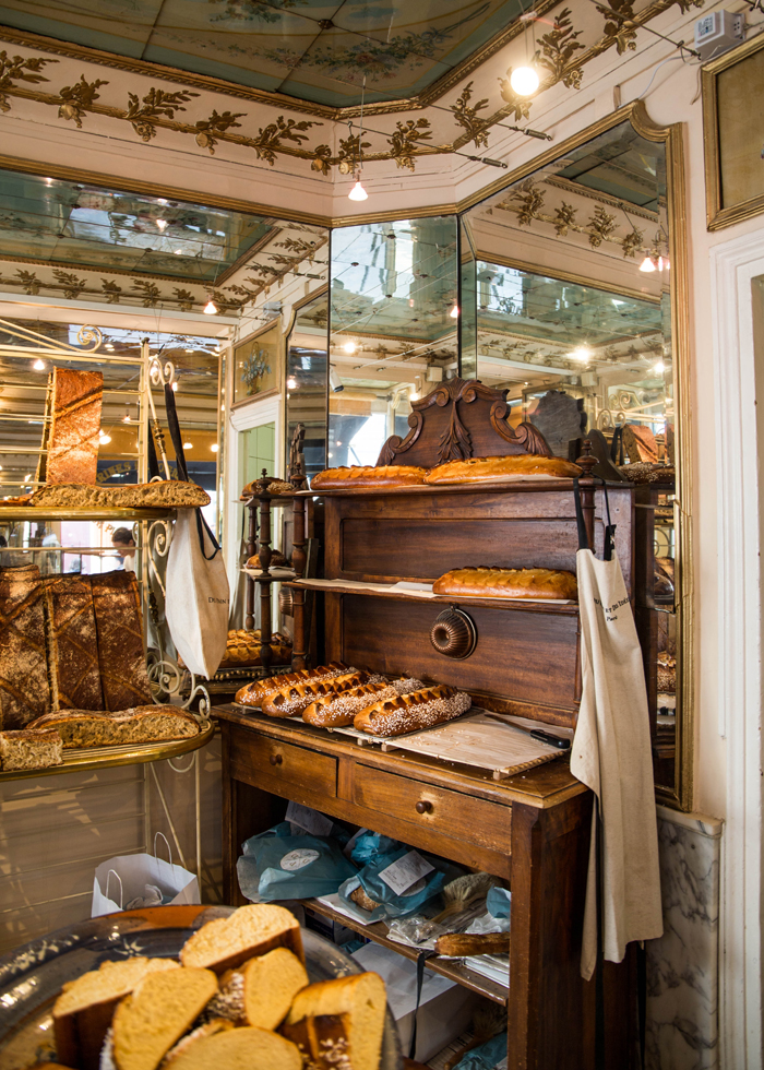 古いブーランジェリーの雰囲気を生かした内装。創業者のクリストフは「ここへ訪れたお客様に昔に戻ったかのような体験をしてほしい」と言います。伝統を大切にする心は、パンの製法だけでなく、インテリアにも現れています。2008年には美食ガイドGault&Millauゴーエミヨーのパリの最高のパン屋さんに選ばれたデュ・パン・エ・デ・ジデ。青い外観が目を引くお店の前には、いつもたくさんの人が並んでいます。