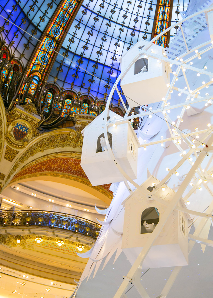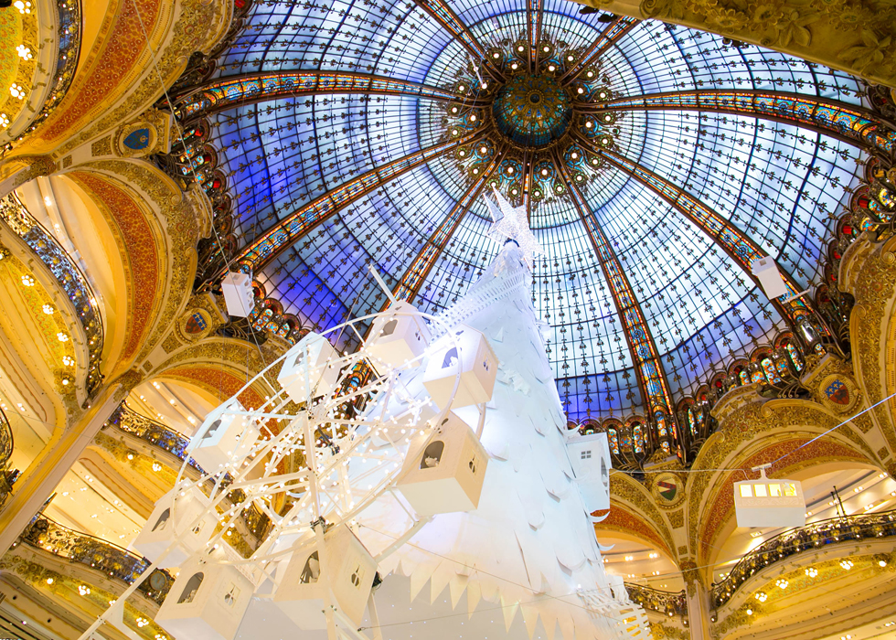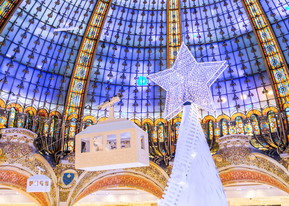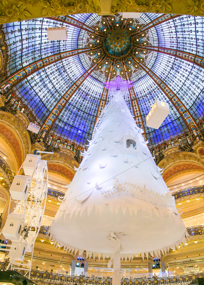 デパートの中へ入ると、ギャラリー・ラファイエットの象徴でもある黄金色のステンドグラスを配したドームの下にある、大きなクリスマスツリーが迎え入れてくれます。2016年の白い大きなツリーは、フランスの芸術家Lorenzo Papaceが紙を使って制作しました。照明によって色が変わり、ギャラリー・ラファイエットに幻想的な魅力を与えています。