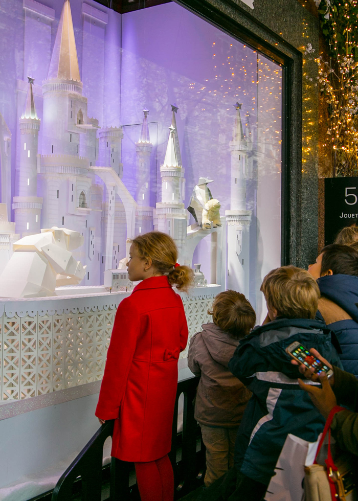 デパート外側、ウィンドディスプレイは一面真っ白のホワイトクリスマス。いくつかのブランドとコラボレーションして制作されたディスプレイは、新しい氷河を探すため、北極から旅をするシロクマの物語になっています。美しいクリスマスキャロルに合わせ、シロクマが可愛く動く姿に、子どもたちはもちろん、大人もみんな童心に返ったように、ウィンドウの中を見つめていました。