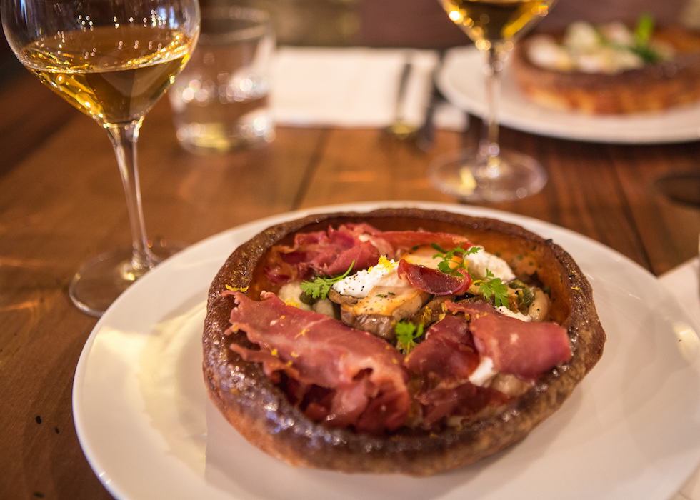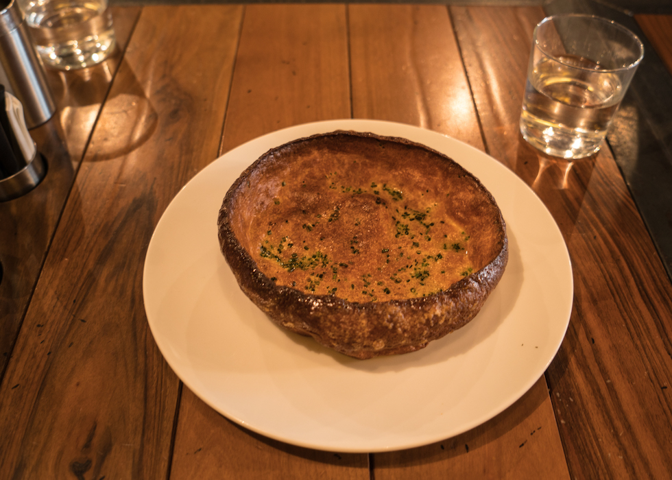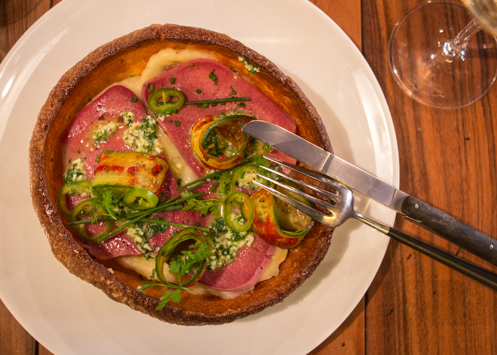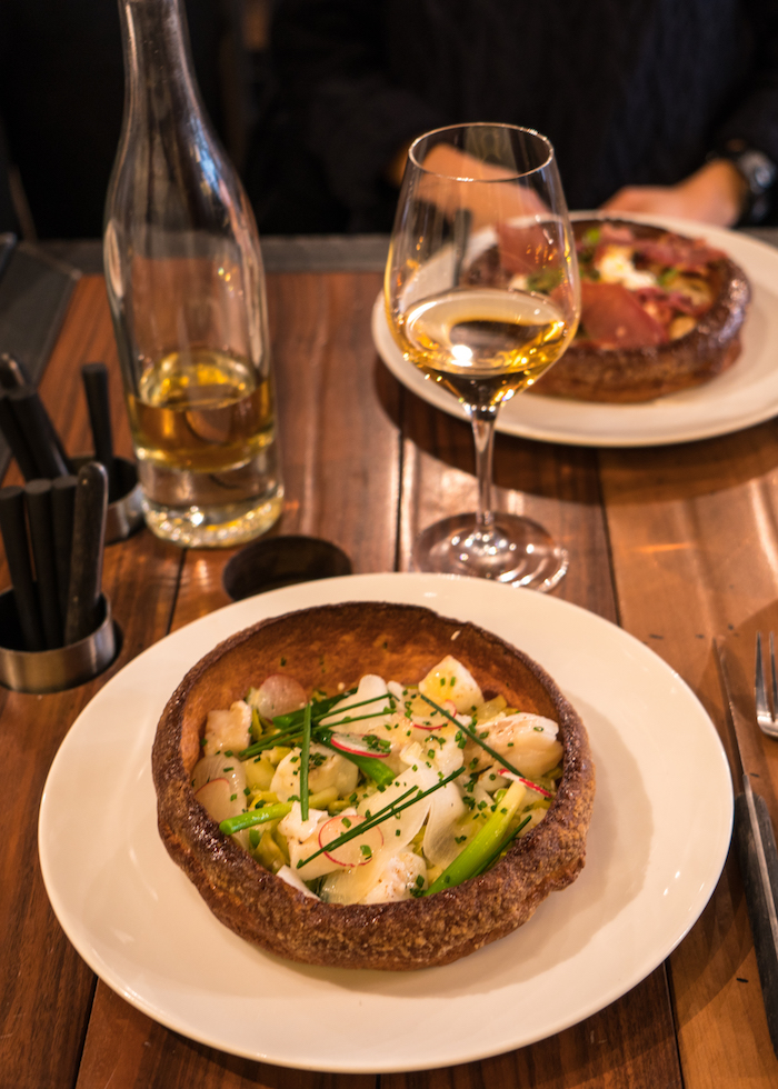 おすすめはもちろんパスカード!卵や小麦粉などから作った生地をオーブンで焼いたもので、生地の縁が立ち上がっており、お皿のようなかたちをしています(下の写真参照)。パスカードの中に料理を入れて、お皿ごと食べられる料理として提供しているのがこのレストランの最大の特徴。