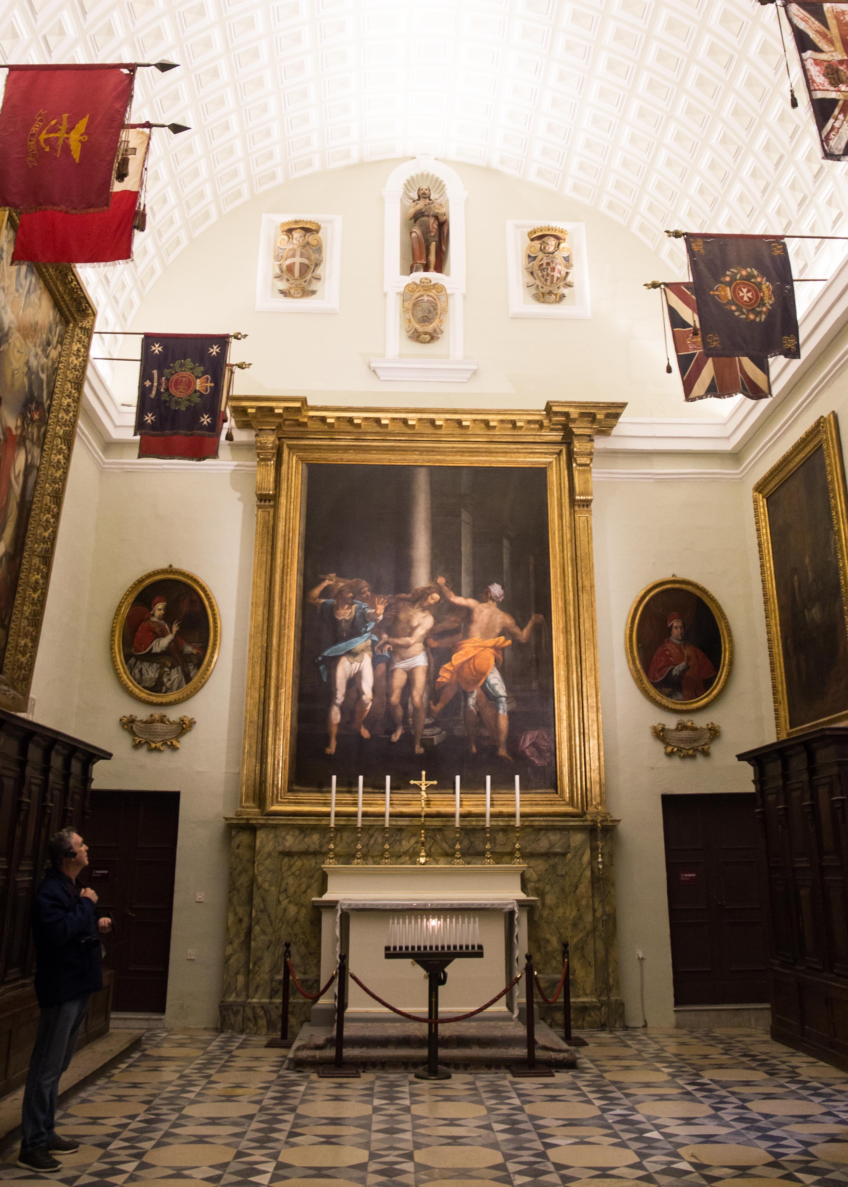 メインの聖堂から繋がっているこの部屋は、「SACRISTY」と呼ばれ、1604年に建てられました。写真中央の祭壇の上の聖ヨハネ蔵のすぐ下にはナイトRaymundo de Vereの紋章が飾られ、その他の2つは宗教のものと、グランドマスターAlof de Wignacourtのもの。