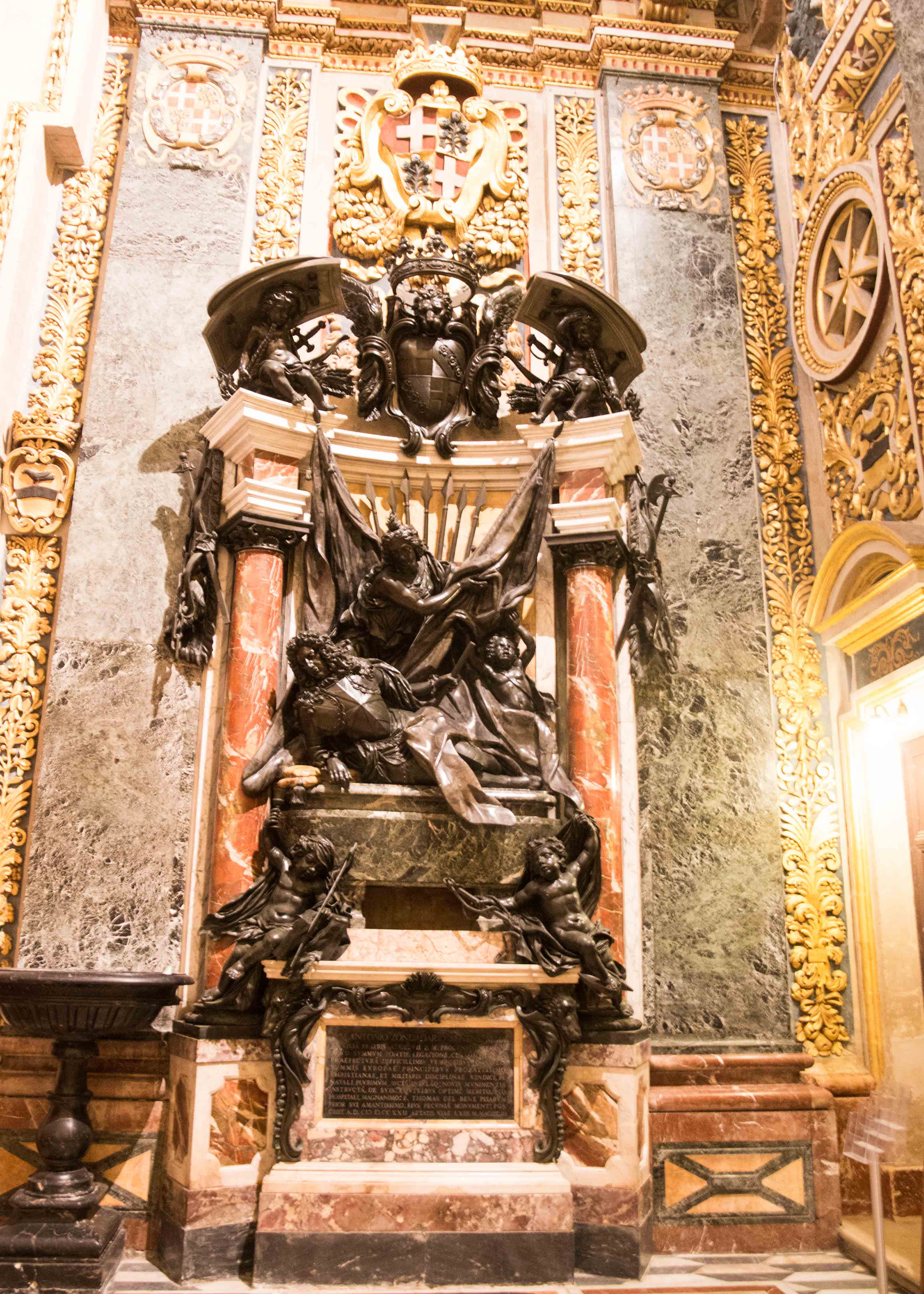 1720年から1722年まで、マルタのグランドマスターとして活躍していたFra' Marc'Antonio Zondadari。彼が国を治めていたのはたったの2年ですが、マルタの人々の間ではとても有名な人物です。彼は、ヴァレッタのPalazzo Carnieroに住み、現在ではそこはオーベルジュドゥバヴィエール(Auberge de Bavière)として知られています。1722年の彼の死後、彼の遺体はこの聖ヨハネ准司教座聖堂内に埋葬され、ブロンズと大理石のこのモニュメントが置かれています。