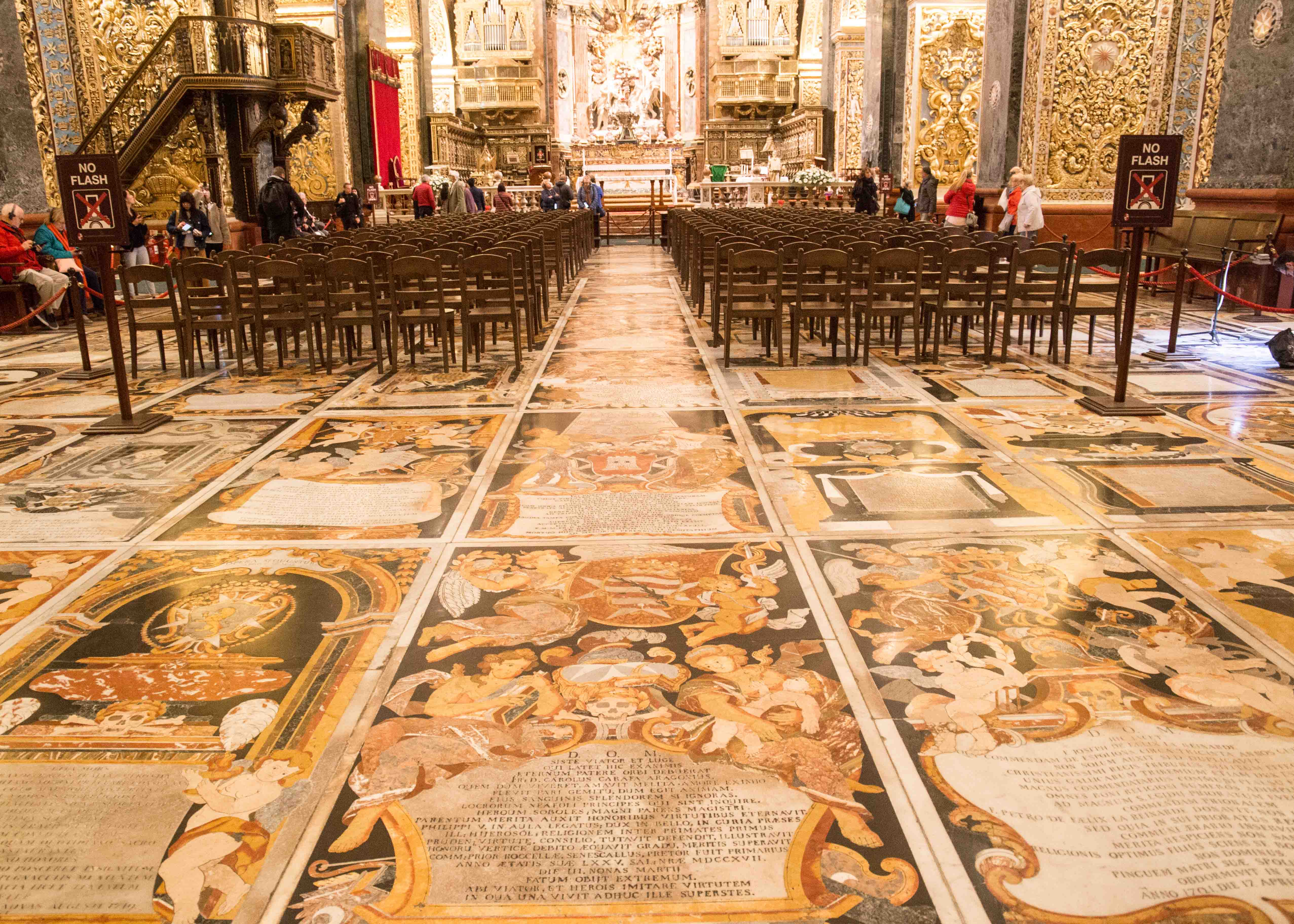 美しいのは天井だけでなく、その床も然り。床全体が400もの墓石で敷き詰められており、それぞれがオリジナルのデザイン、色で、17世紀から19世紀の大理石でできています。この墓石は、聖ヨハネ騎士団の有名な騎士たちや、勝利、名声、死などを意味するシンボルが散りばめられています、中でも最も有名なのは、死を意味する、釜と砂時計を持った骸骨とトランペットを吹く天使が描かれたもの。教会内の床を探してみてくださいね。