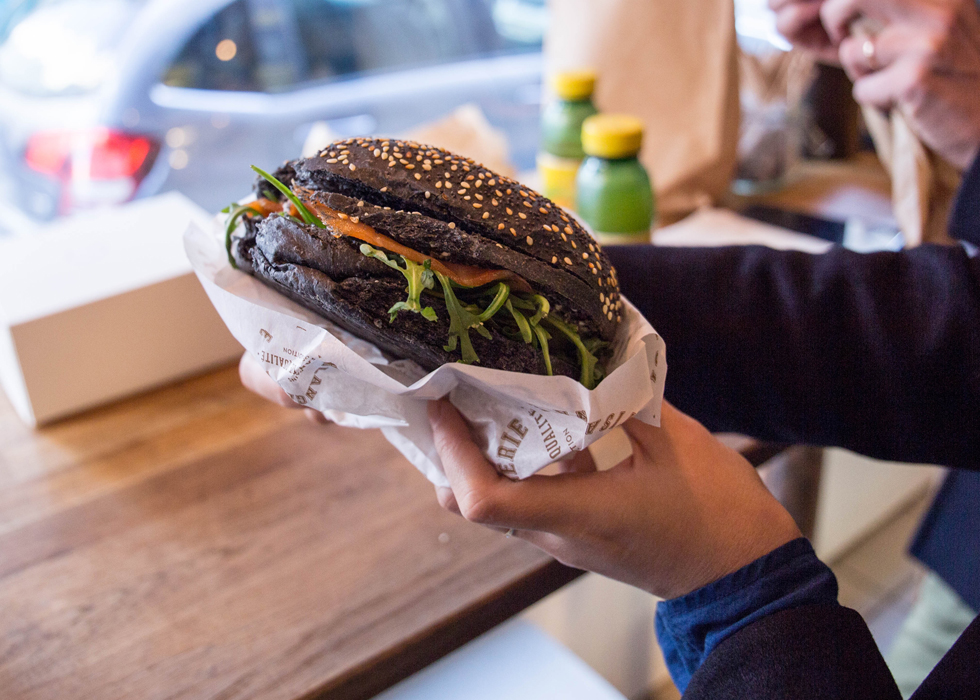 黒ごまのバンズにスモークサーモンと野菜の入ったサーモンバーガー!