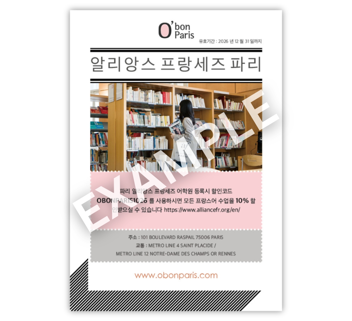 공식 웹사이트 https://www.alliancefr.org/en/ 에서 수강신청시 프로모션 코드 OBONPARIS1026 을 사용하시면 10% 할인을 받을 수 있습니다.