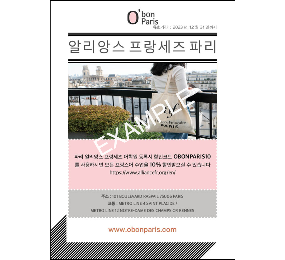 공식 웹사이트 https://www.alliancefr.org/en/ 에서 수강신청시 프로모션 코드 OBONPARIS1025 을 사용하시면 10% 할인을 받을 수 있습니다.