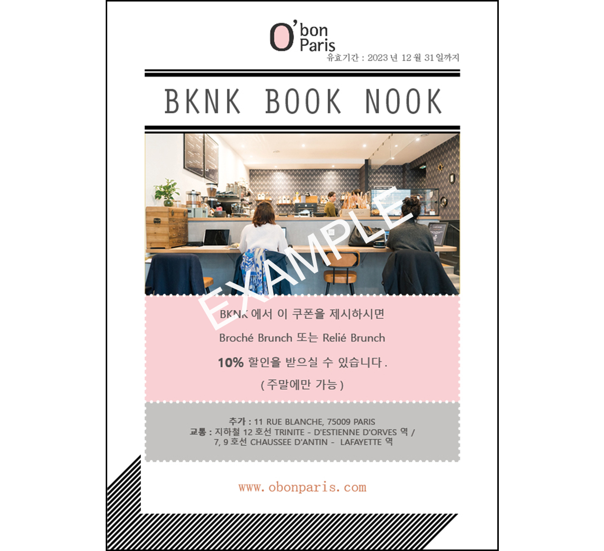 BKNK로도 알려진 BOOK NOOK은 파리의 중심부를 즐기고 싶은 사람들이 들러야 할 완벽한 장소입니다. 많은 독립 출판사들과 협업을 진행하는 공간이며 주말에는 편안한 분위기에서 브런치를 즐길 수 있는 곳입니다. 오봉파리 쿠폰을 다운받아 10% 할인된 가격으로 Broché Brunch / Relié Brunch를 즐겨보세요.
