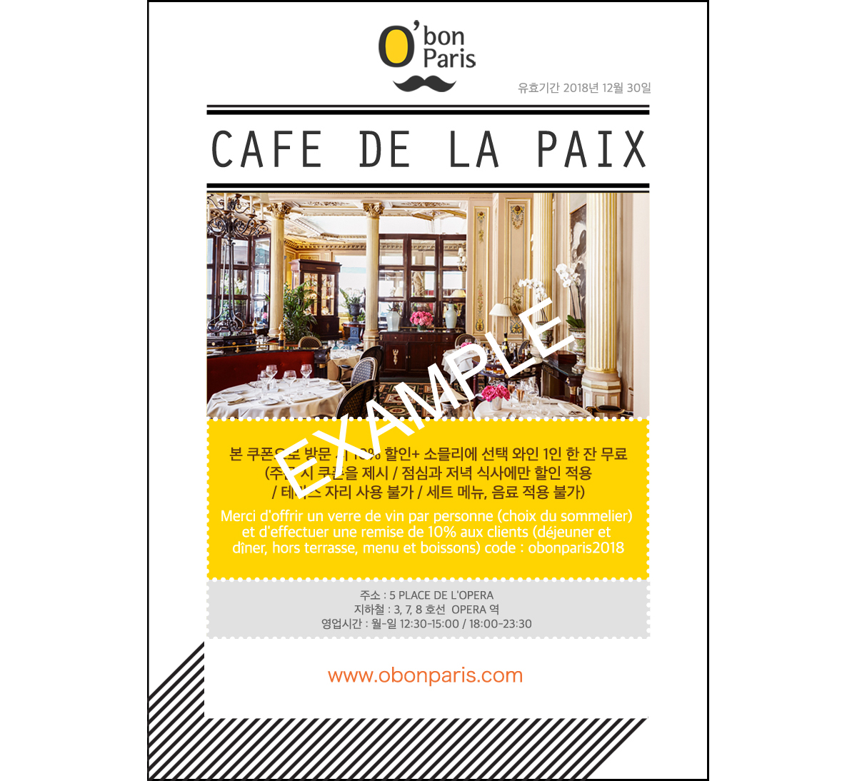 오봉파리 쿠폰으로 10% 할인 혜택과 와인 한 잔을 서비스로 받을 수 있다. 주문 전 미리 쿠폰을 제시해야 하며 테라스 석과 세트 메뉴, 음료를 제외하고 점심 및 저녁 식사에 쿠폰 할인이 적용된다.