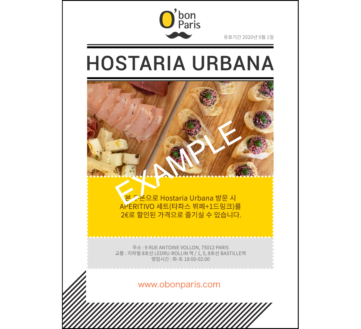 로컬 파리지앵들만 가는 바의 분위기를 느끼고 싶다면 호스타리아 얼바나를 추천!. 오봉파리 쿠폰을 사용하시면 매주 화요일과 수요일, 아페리티보 메뉴에 2유로 할인을 받으실 수 있습니다.